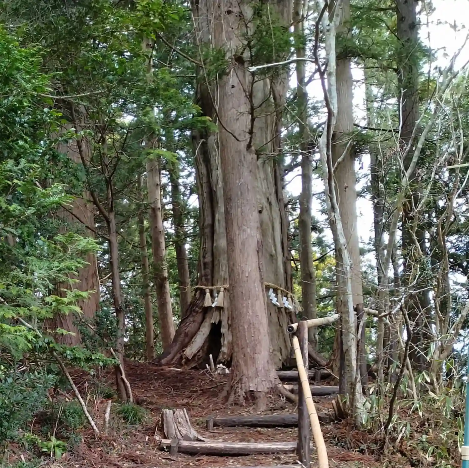 零羊崎神社 木の裏にあるのが(樹齢500年)の御神木大杉の様子です