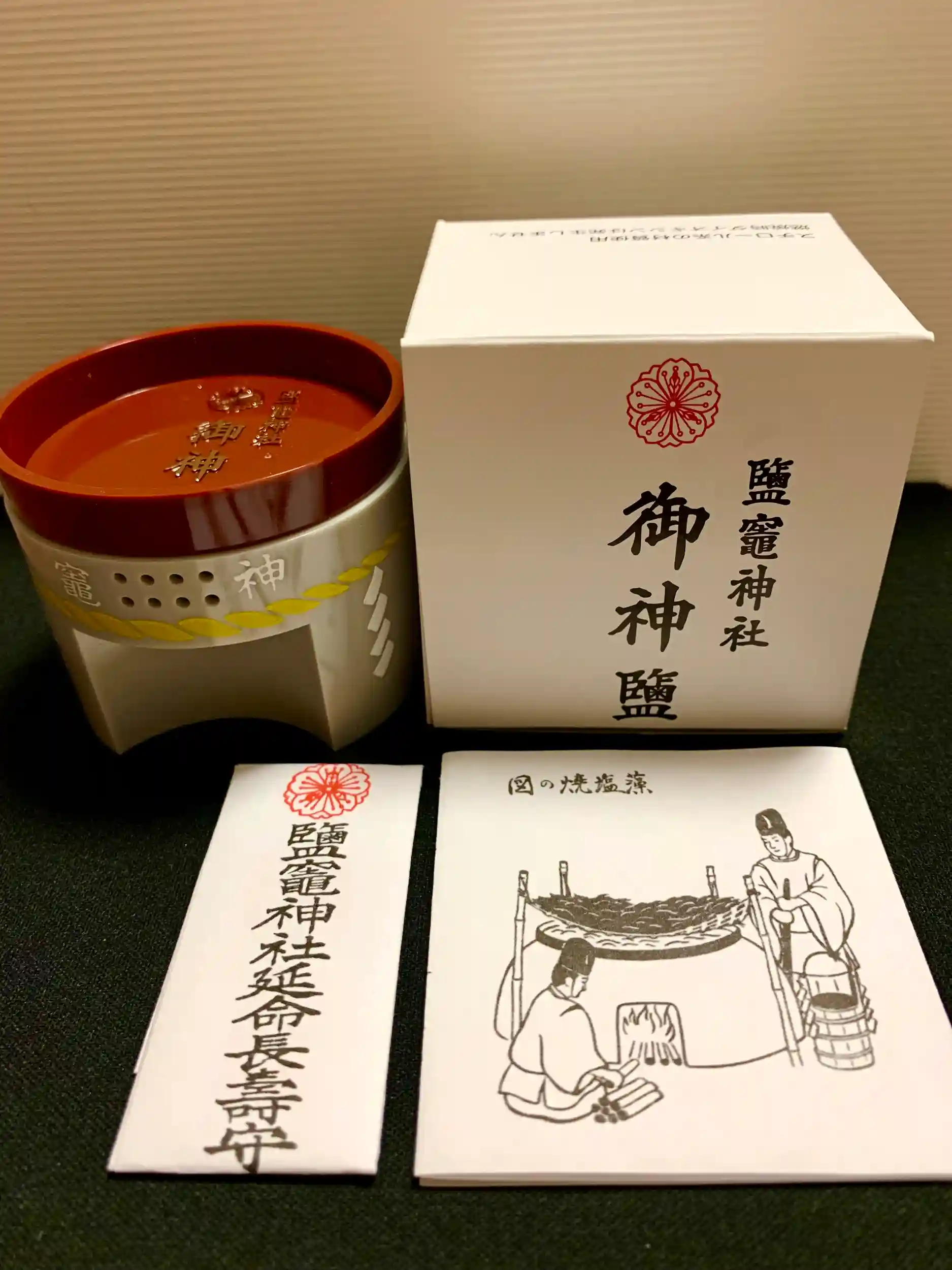 授与品の「御神鹽」神釜をモチーフにした容器に塩が入っています。延命長寿の御守り付き