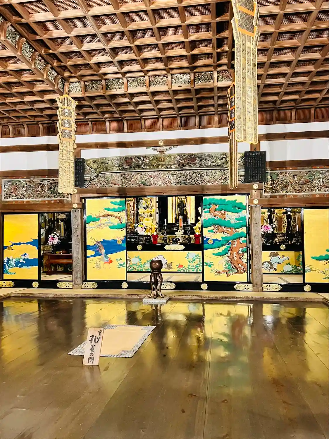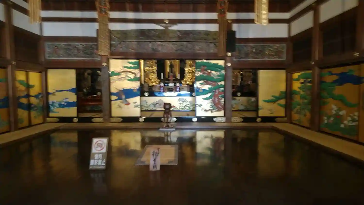 本堂は幾つもの部屋に分かれ、それぞれ違うテーマで襖に豪華な金の背景で絵が描かれています。
