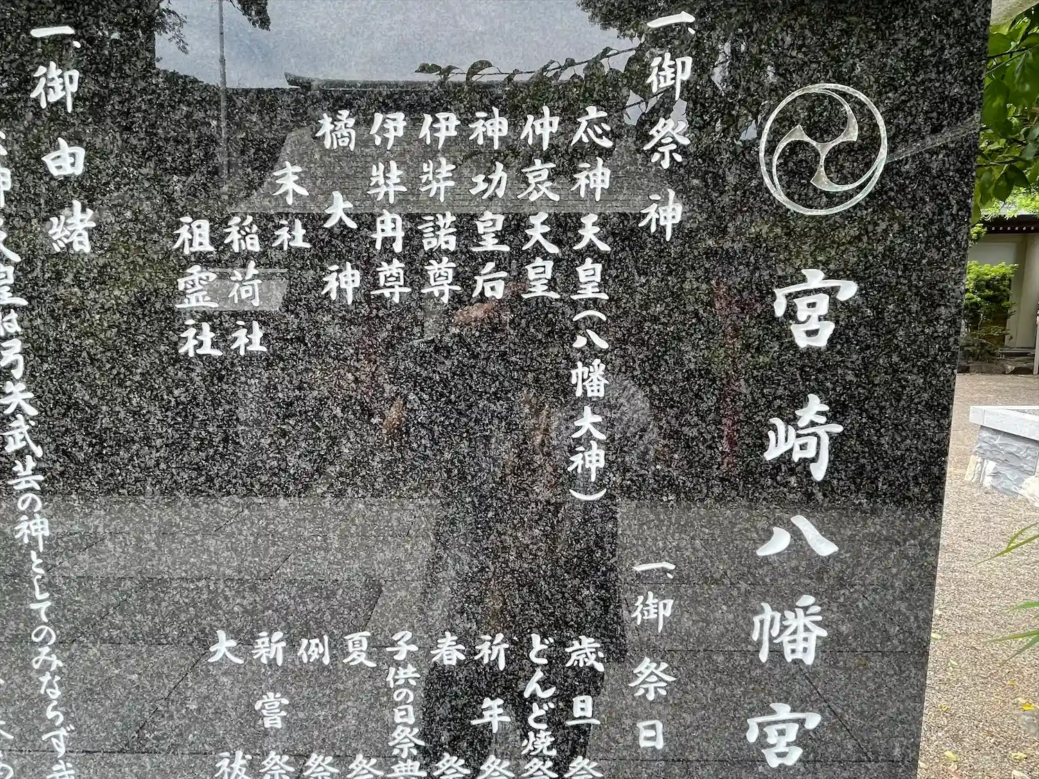御祭神は、誉田別尊(応神天皇)、足仲彦尊(仲哀天皇)、息長帯姫尊(神功皇后)、伊邪那岐命、伊邪那美命、橘大神。