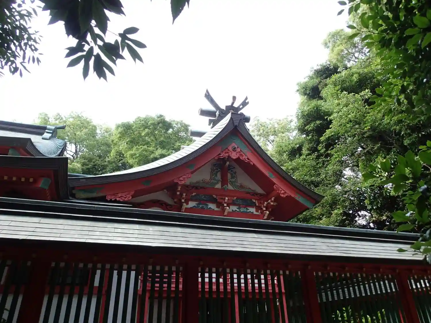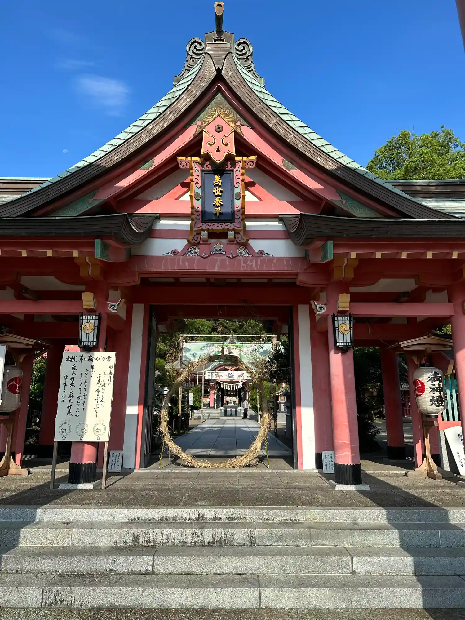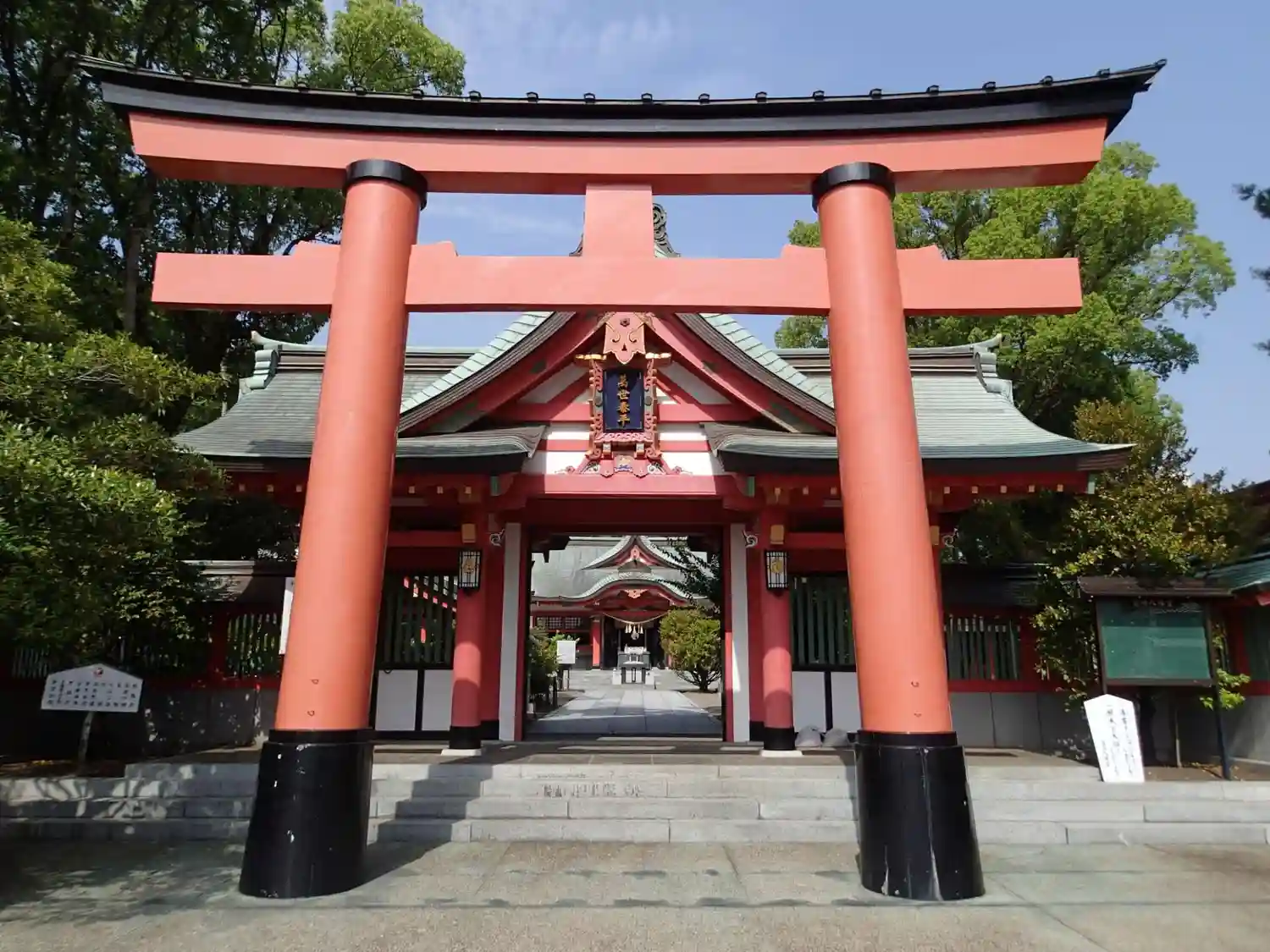 赤くて大きな鳥居の奥に神門があり、立派な造りです。