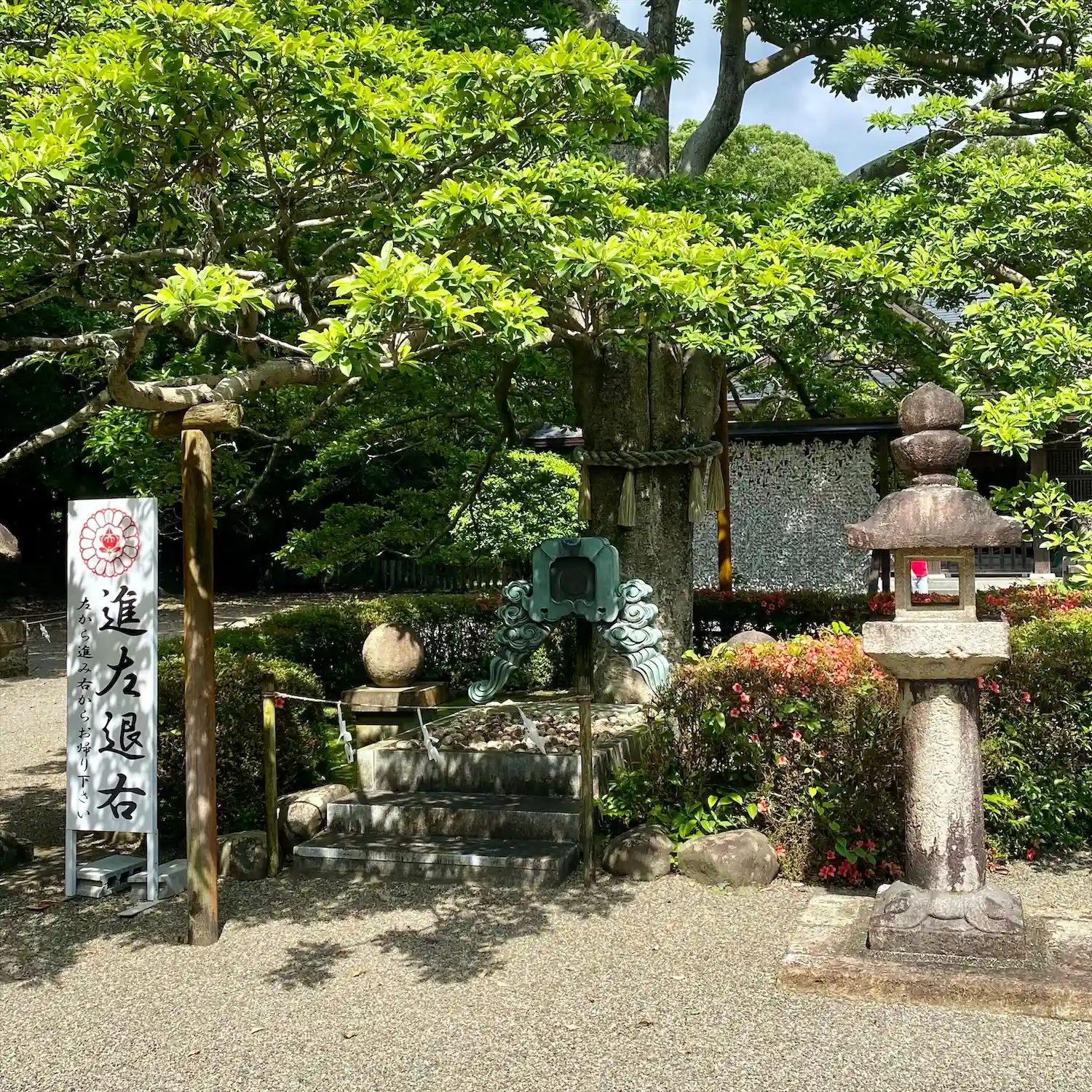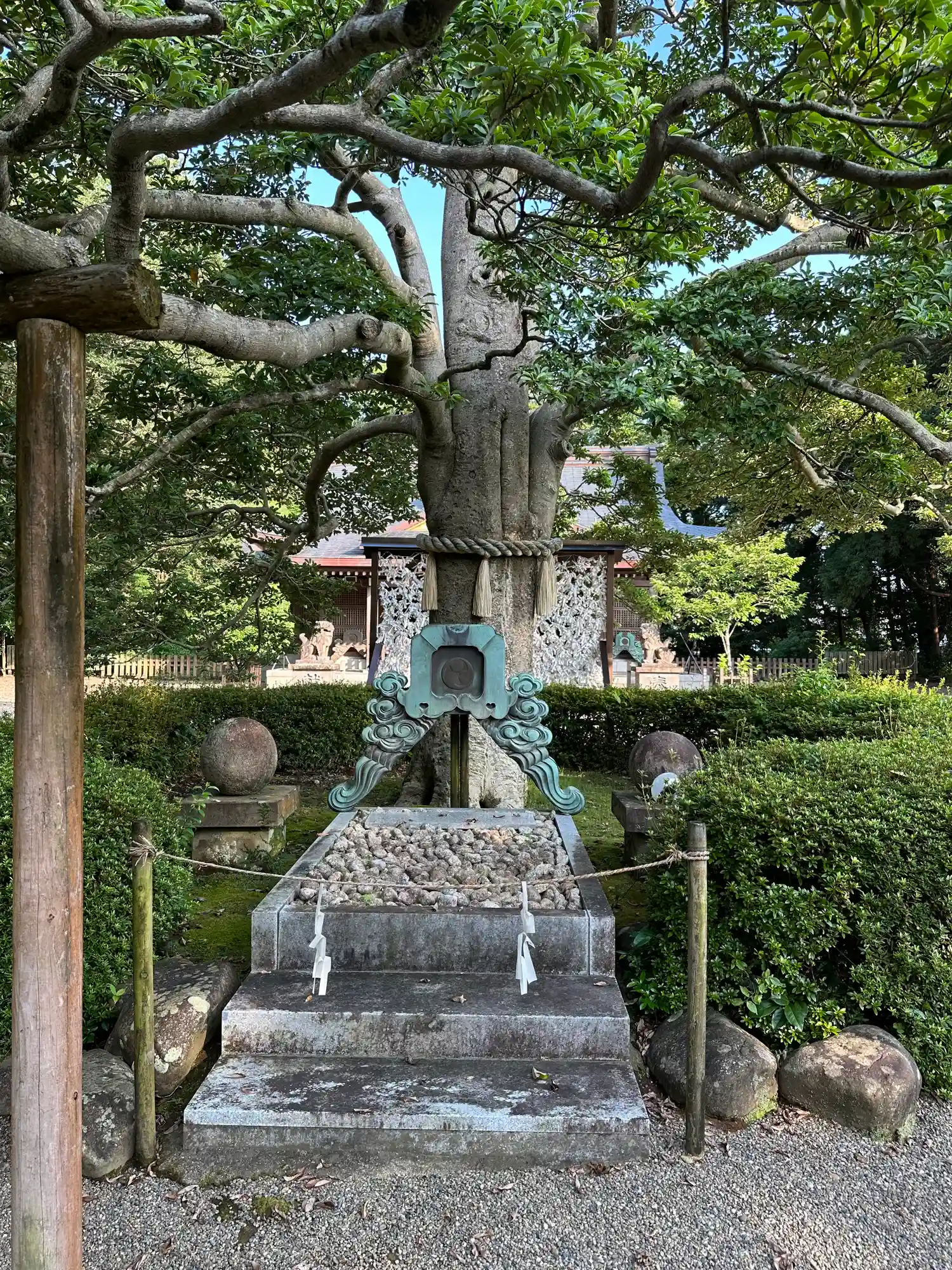 招霊の木と石灯籠:1693年に宮崎で最も古い豪商・日高屋から奉納されたもの