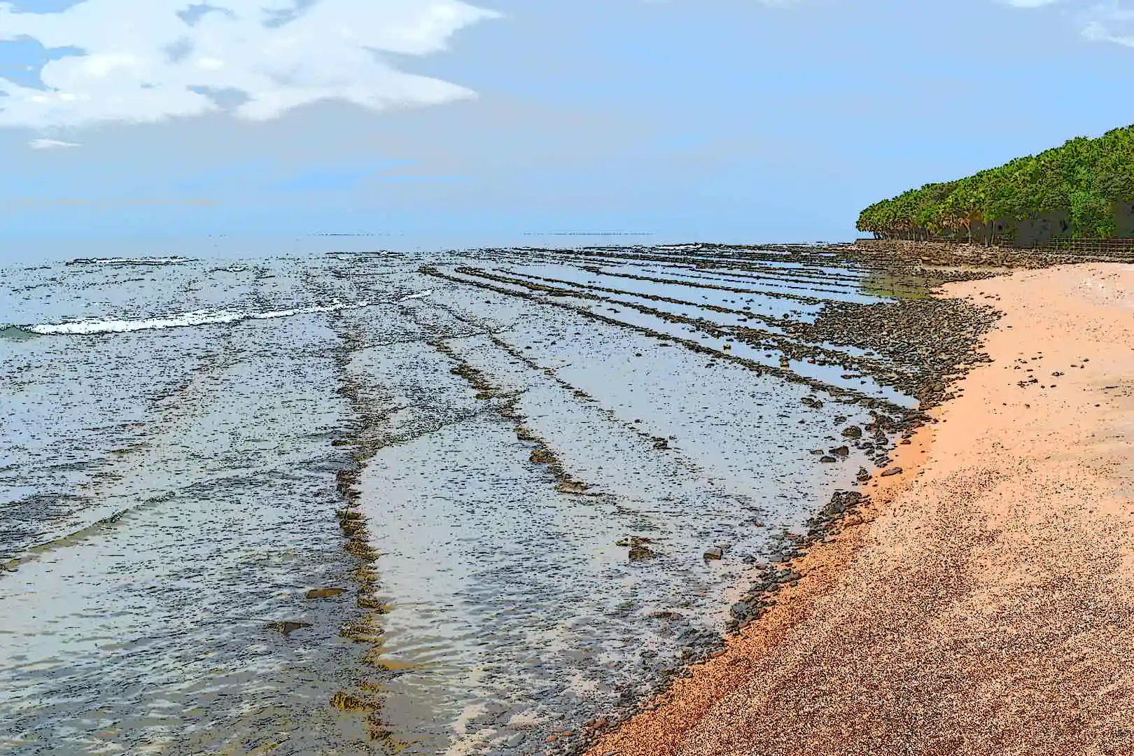 国の天然記念物「鬼の洗濯板」を横目に見ながら、弥生橋を渡ります。果てしなく平行に続く見事な景観に、これが本当に天然物なのかと驚かされます。「自然が作った奇跡」を間近で見られるチャンスです!