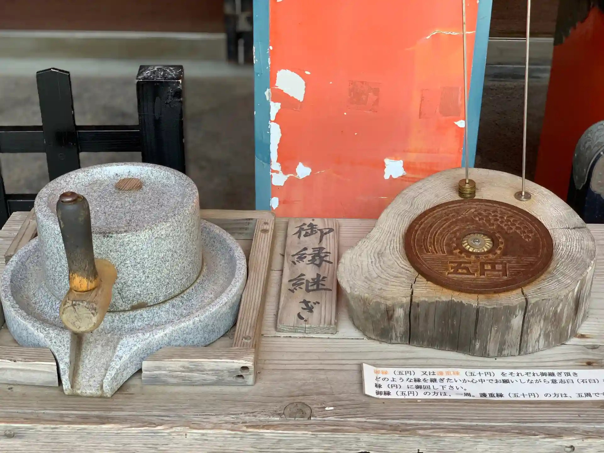 5円玉を石台に乗せて、願いを込めながら臼のような形でゴリゴリ回します。