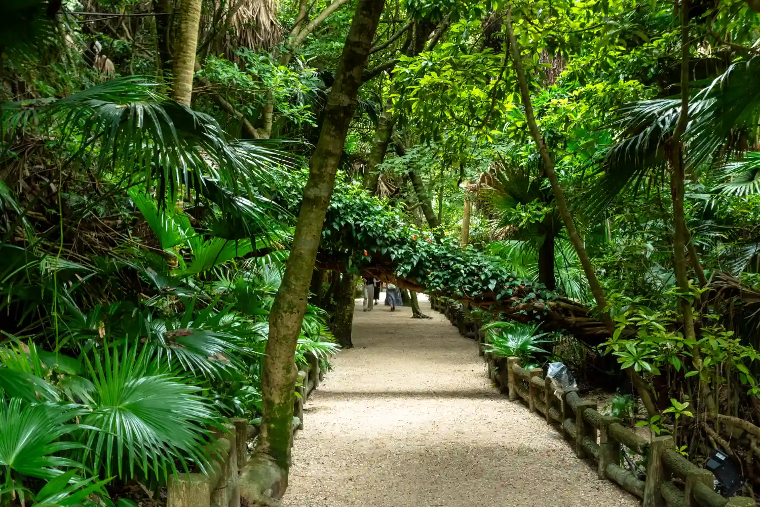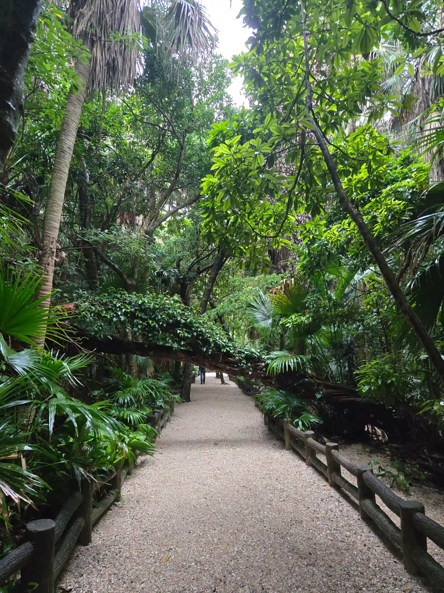 ビロー樹と熱帯植物・亜熱帯植物群の説明。朝日が差し込みキラキラしていました。