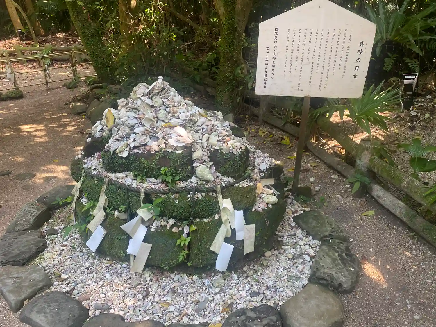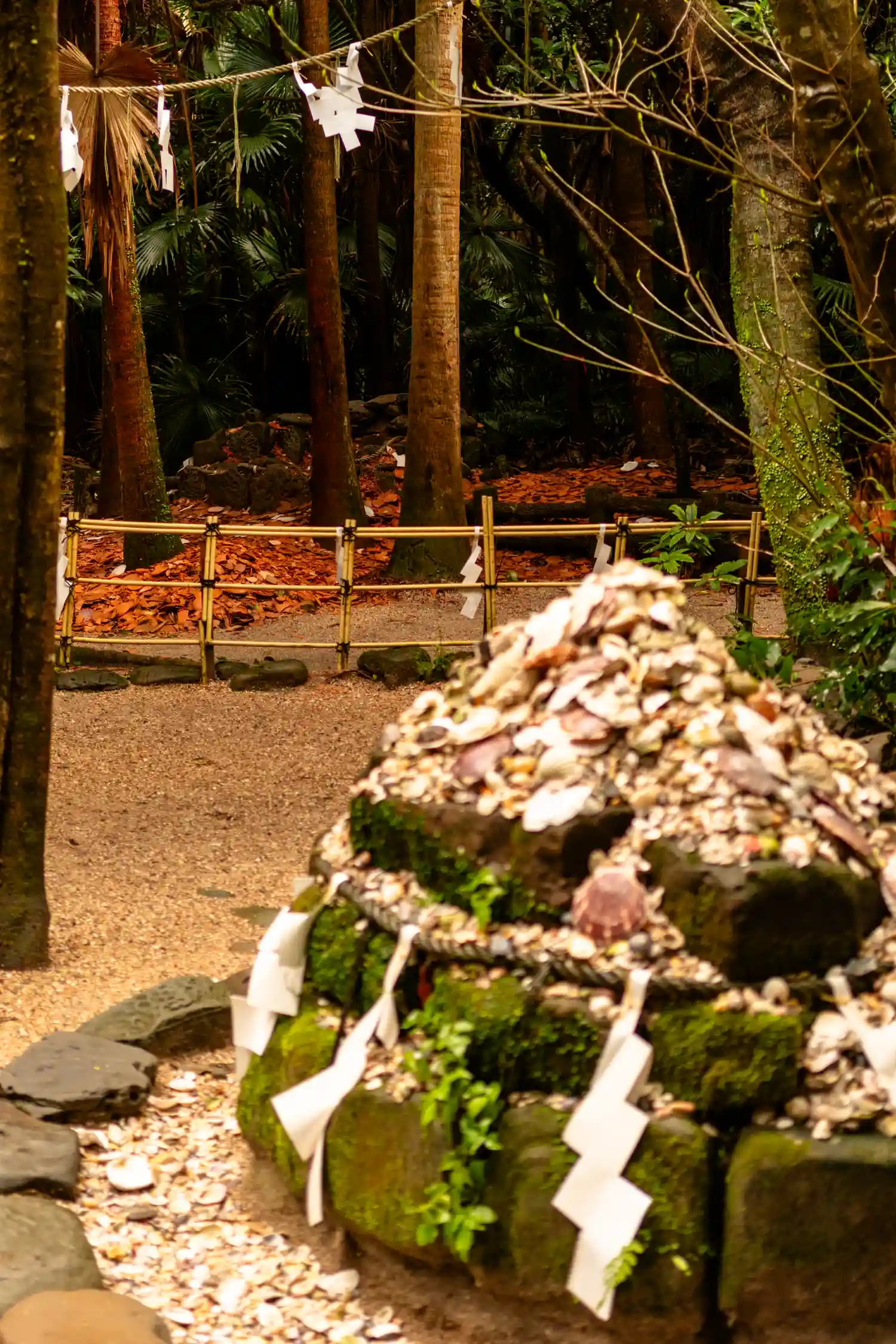 まっすぐ伸びる参道の、周りの薄い茶色の部分は、砕けた貝殻でした。