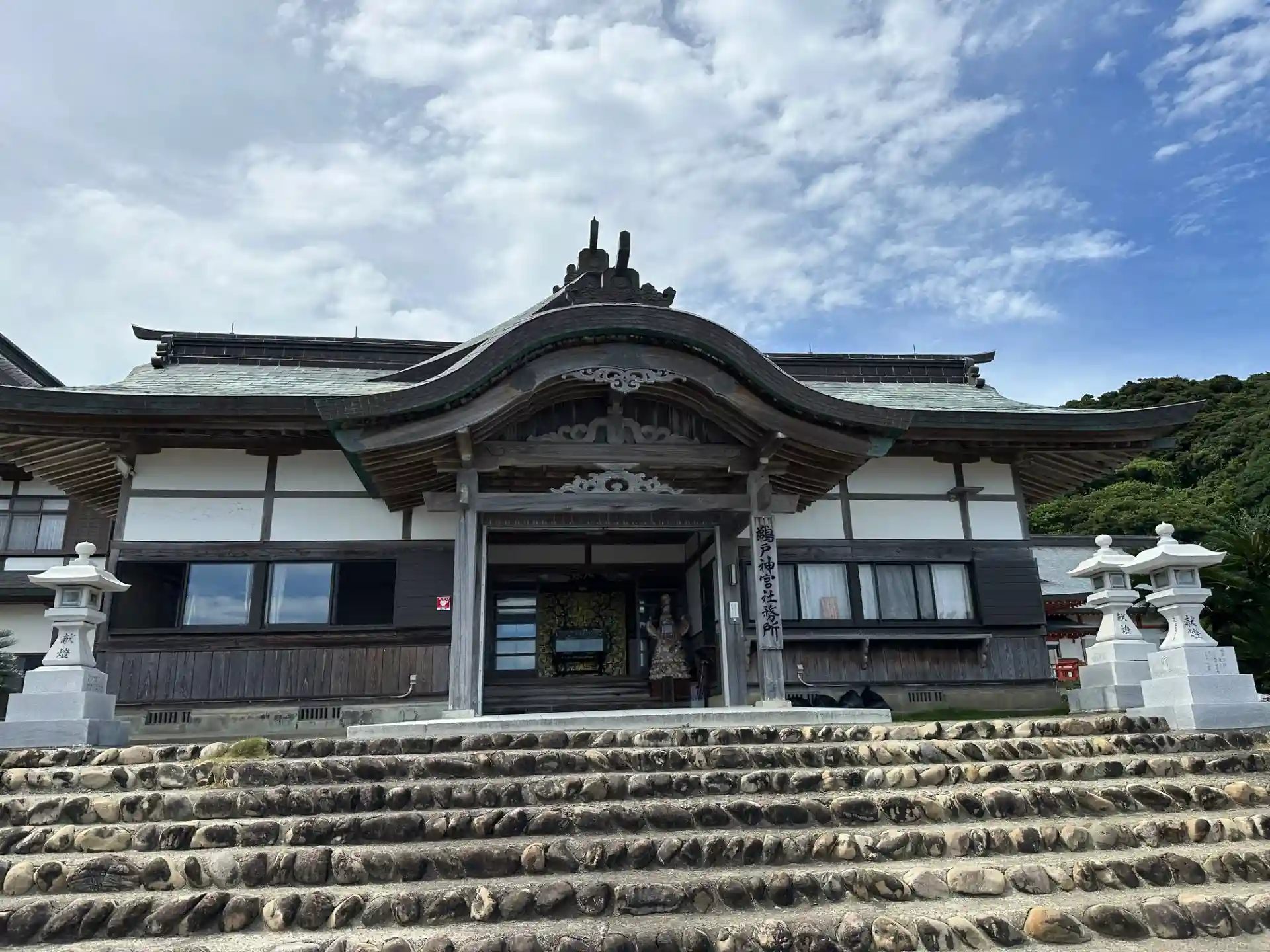 地神五代の鸕鶿草葺不合尊さまを祀る神宮号を持つ神社です。日向灘に面する岩壁にあり古代の海洋信仰を起源として修験道の行場として栄えていました。上野一之宮貫前神社、草部吉見神社とともに「三大下り宮」に数えられています。
