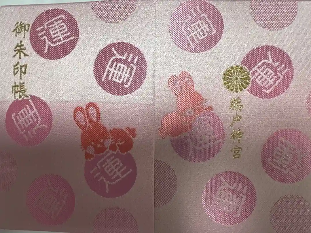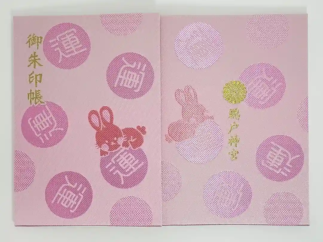 ピンク色の地に運玉が散りばめられ、運玉に乗った可愛らしいウサギが2匹、表面は左上に御朱印帳の文字、裏面は真ん中に菊花紋と鵜戸神宮の文字が入っています。