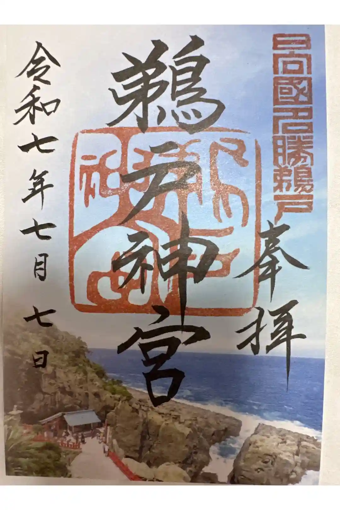 背景に鵜戸崎の日向灘と社殿が印画され、真ん中に鵜戸神宮と書かれ、右下に日向國名勝鵜戸の印、真ん中に鵜戸神宮の印が押されています。