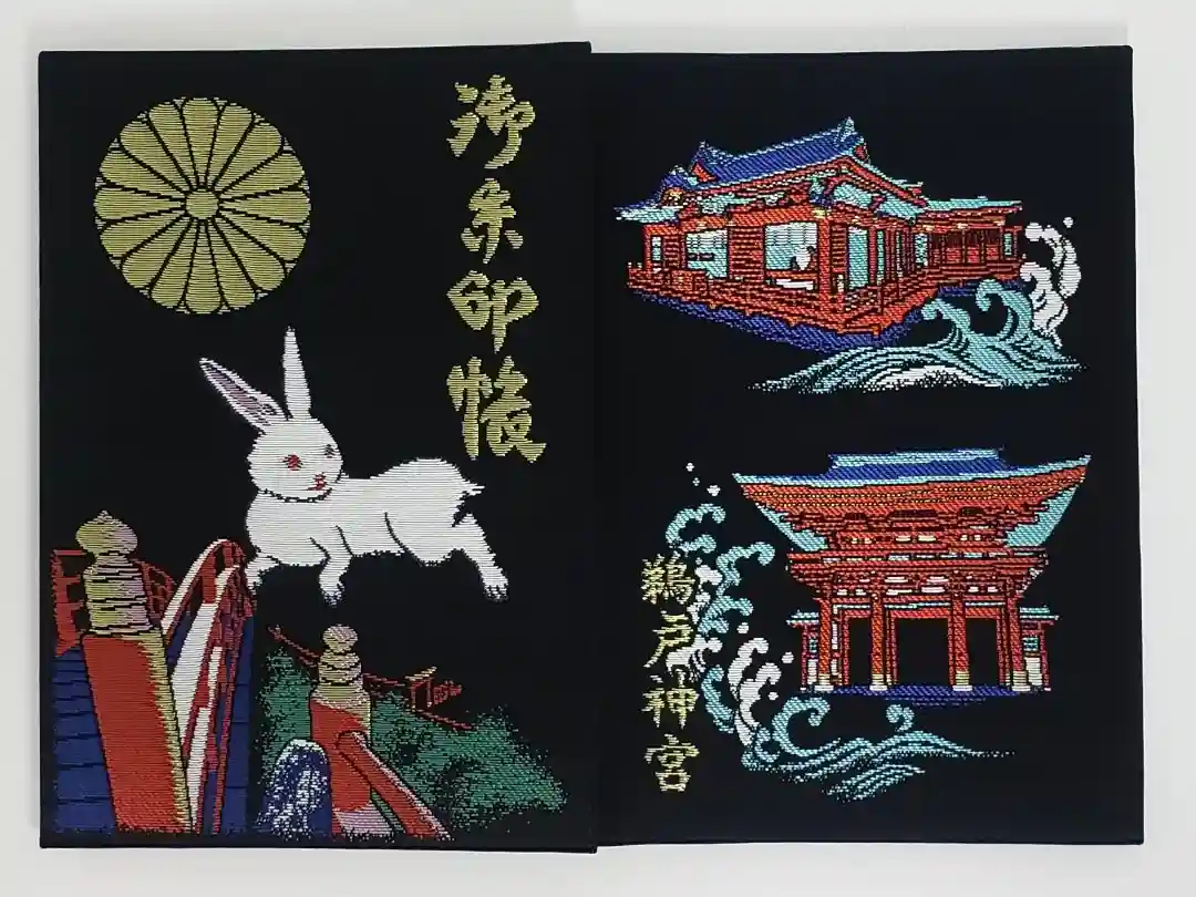 黒色の地に、表面は真ん中にウサギ、下部に下り宮の石段が描かれ、右上に御朱印帳の文字、左上に菊花紋が入り、裏面は上部に本殿、下部に楼門、打ち寄せる波が描かれ、左下に鵜戸神宮の文字が入っています。