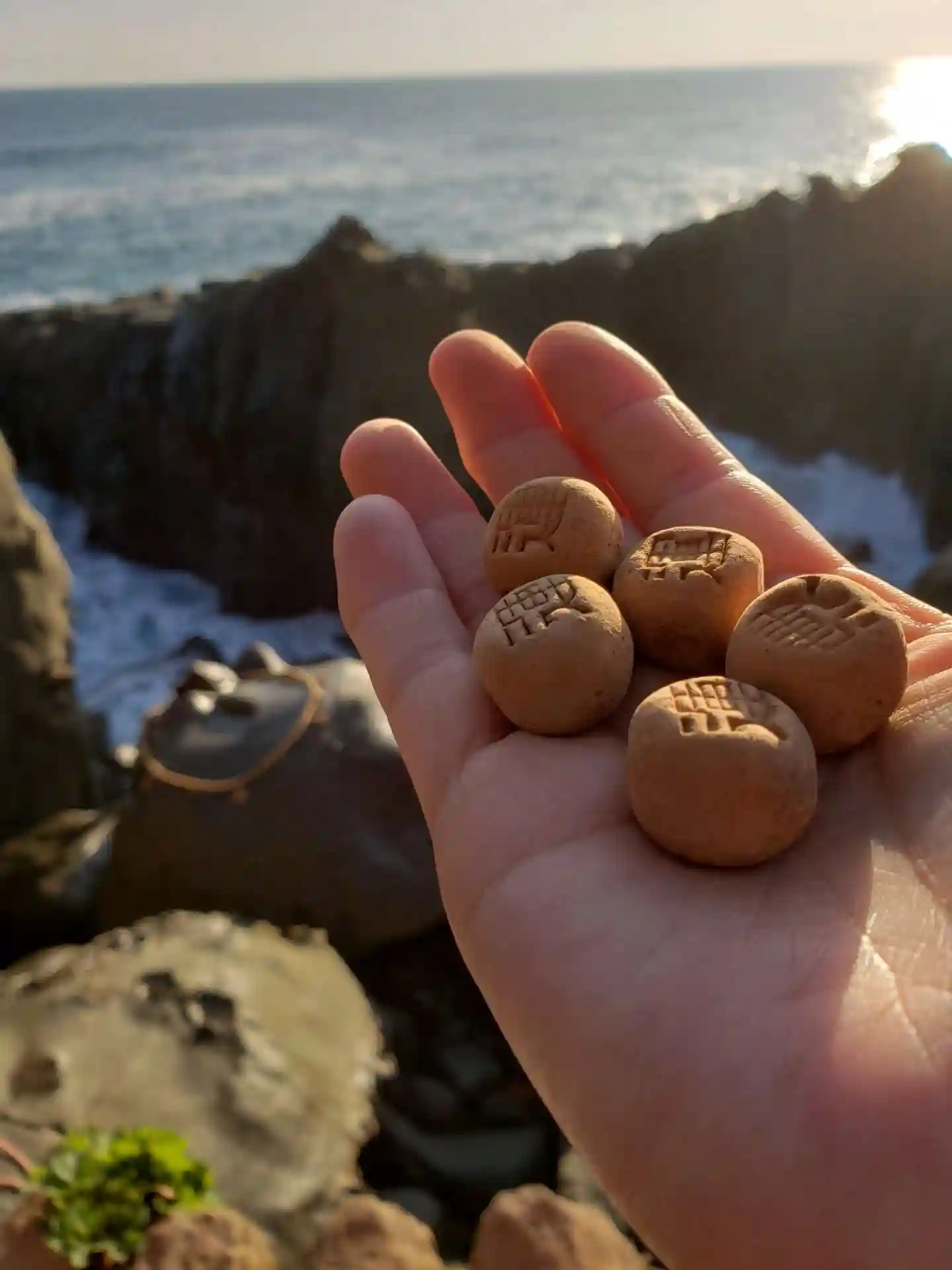 亀石に投げる石。100円。おみくじのような無人販売で硬貨を入れて購入。