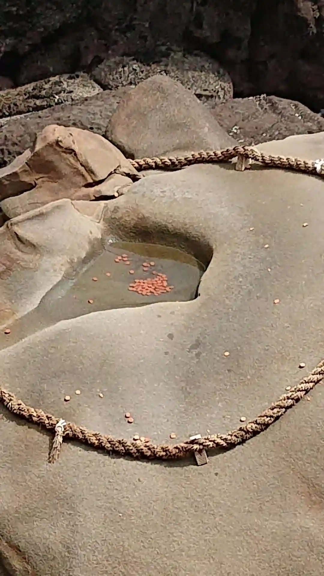 運玉。後方の輪に投げ入れられると願いが叶うとか。岩に当たって砕けた欠片が入ったけど…これは入ったことになるかな?