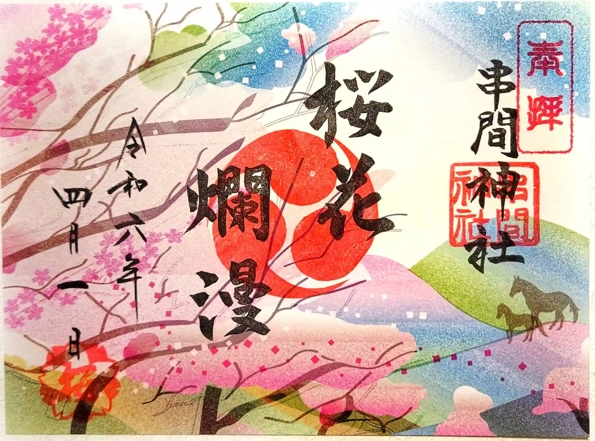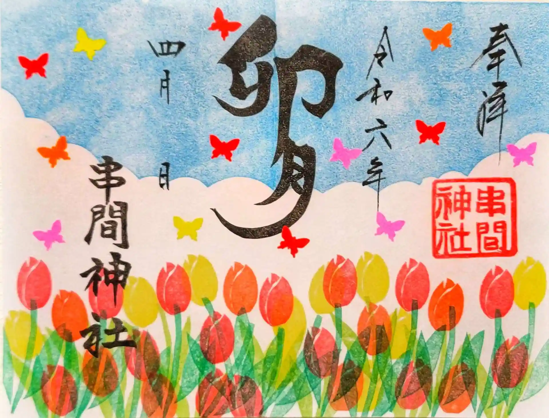 4月の御朱印はサクラをデザインした①『桜花爛漫』、そして境内に咲き誇る②『チューリップ』の御朱印となります☺️
