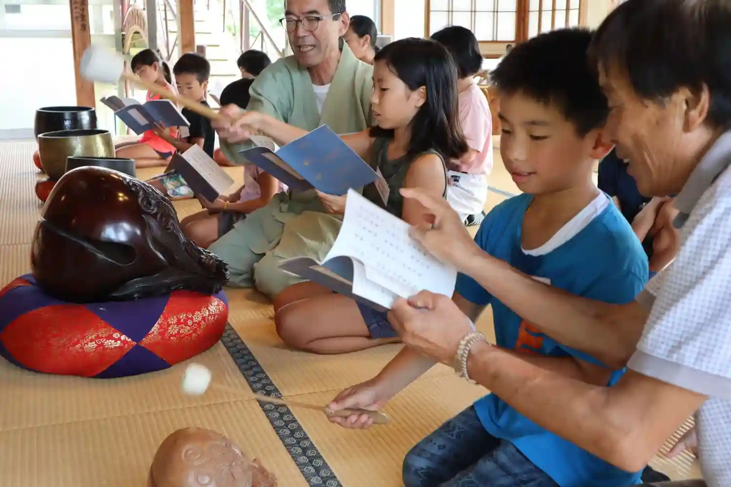 お寺は昔、子どもたちの学びの場でもありました。夏休みこども寺子屋では、お寺の掃除から始まり、座禅をしたり、茶道や生け花など、日常から離れて普段できない貴重な経験ができます。地元産品を使った精進料理も。