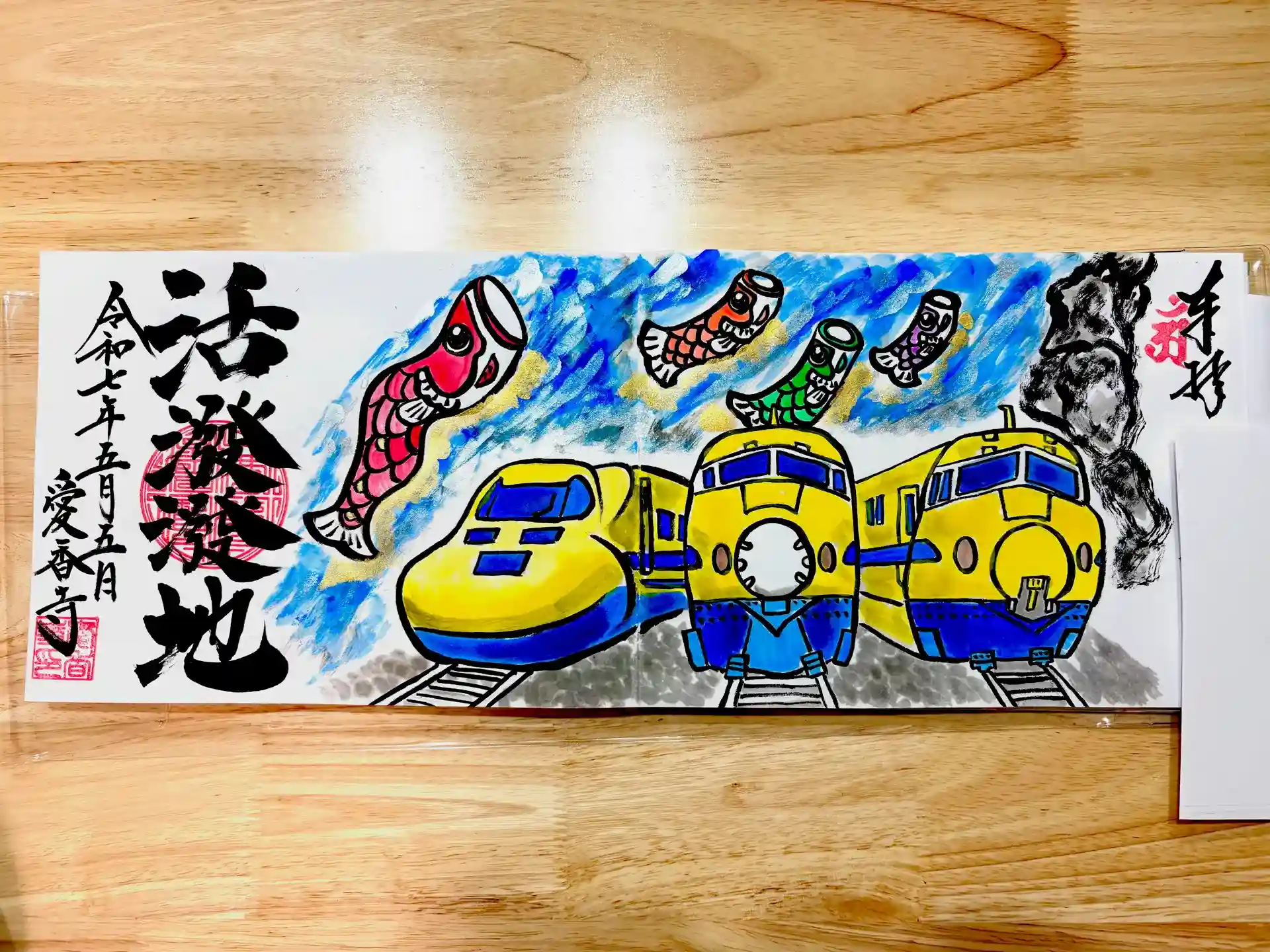 オーダー御朱印ドクターイエローと滝登り鯉のぼりです。詳しくは愛香寺Instagramをご覧下さい。