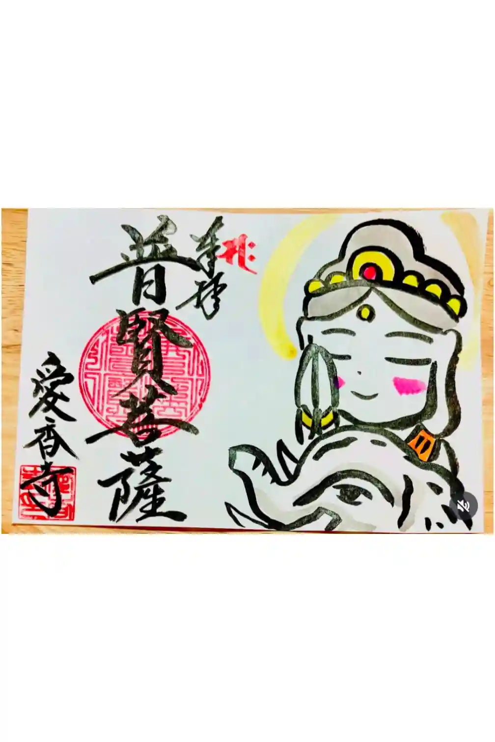 いつも素晴らしいアート御朱印を拝受していますが、今回は書き置きを頂きました。御朱印はあくまで御朱印長に収めるのが本筋かと思います。ただ家族にも観て幸せな気持ちになる御朱印です。また季節や月毎に様々な御朱印を書いておられます。ですので、一旦額縁に入れ、家族でシェアして、季節が変わる毎に御朱印帳に収めて、新しいものをまた書いて頂き、額に入れて家に飾っています。