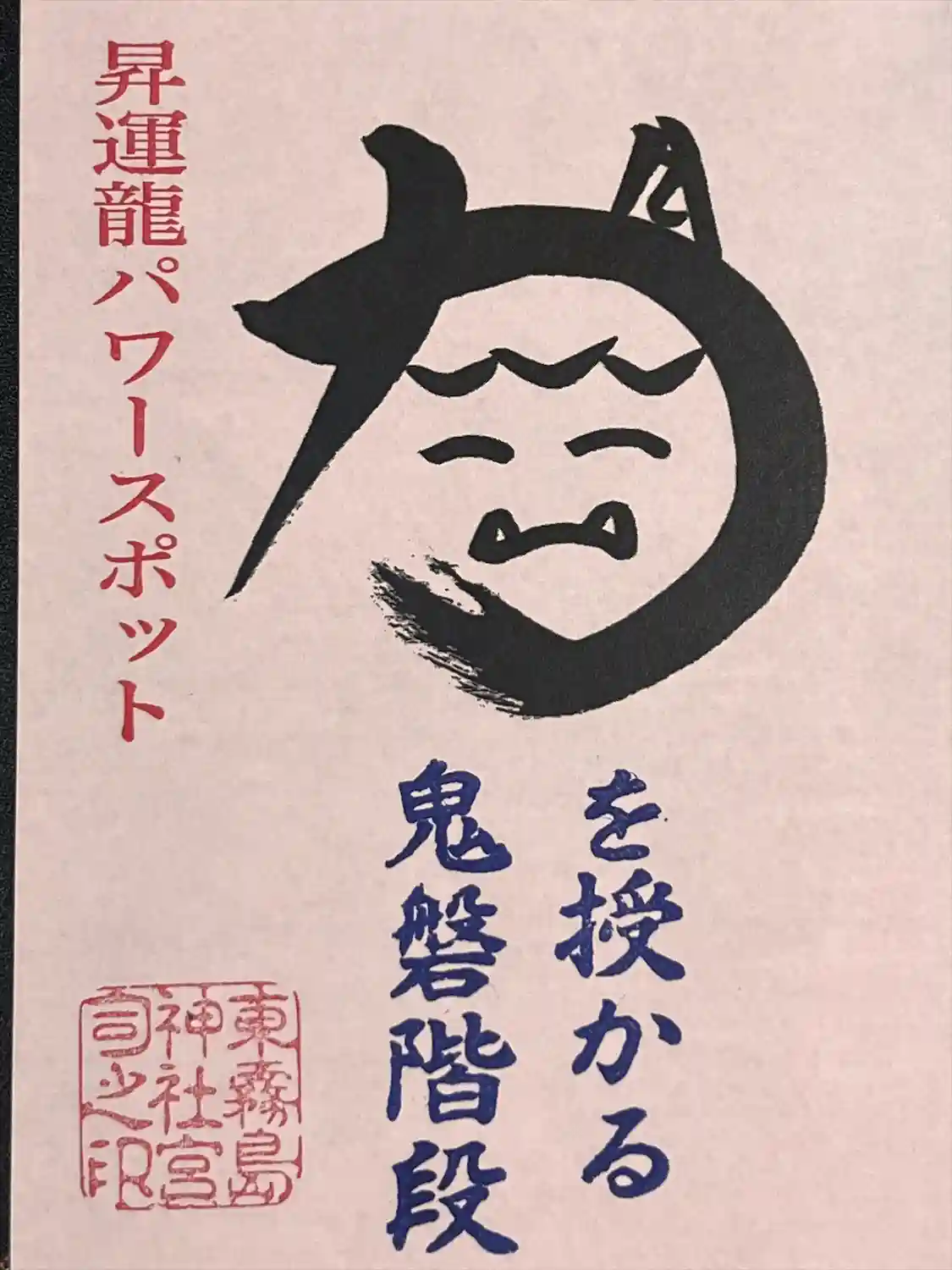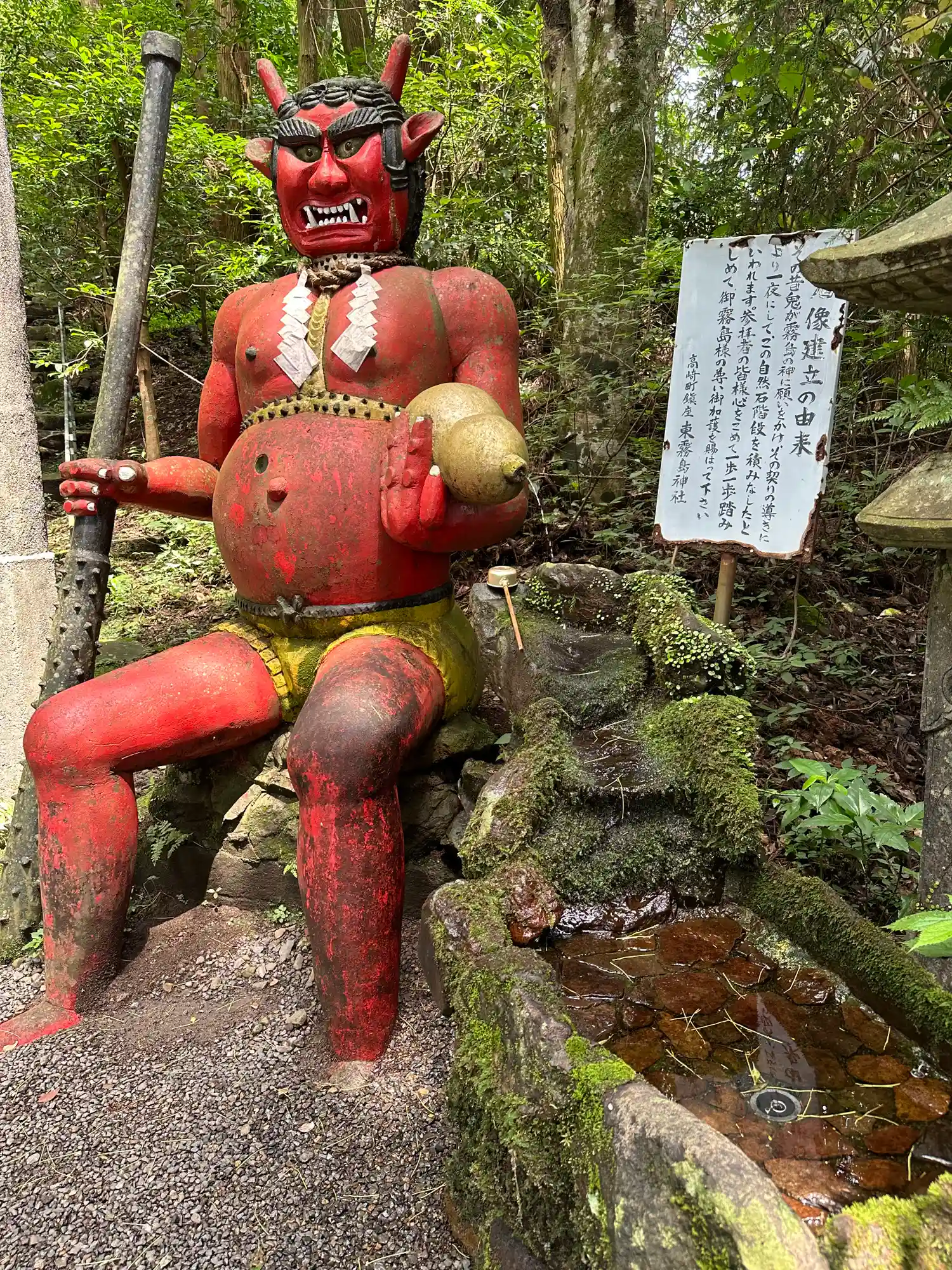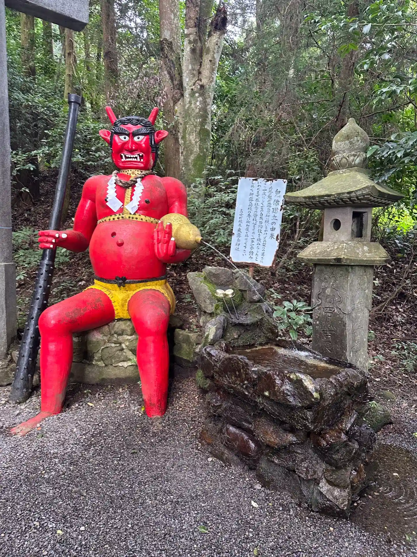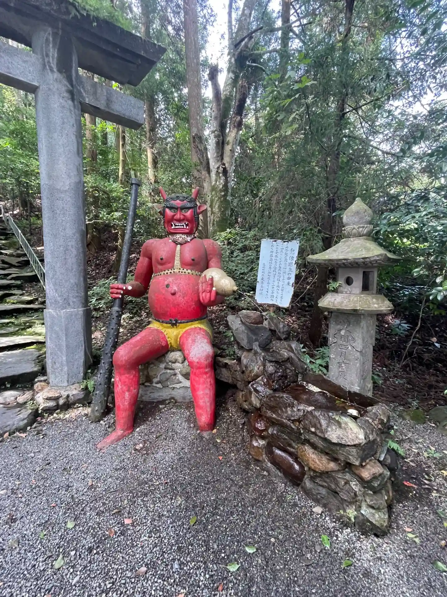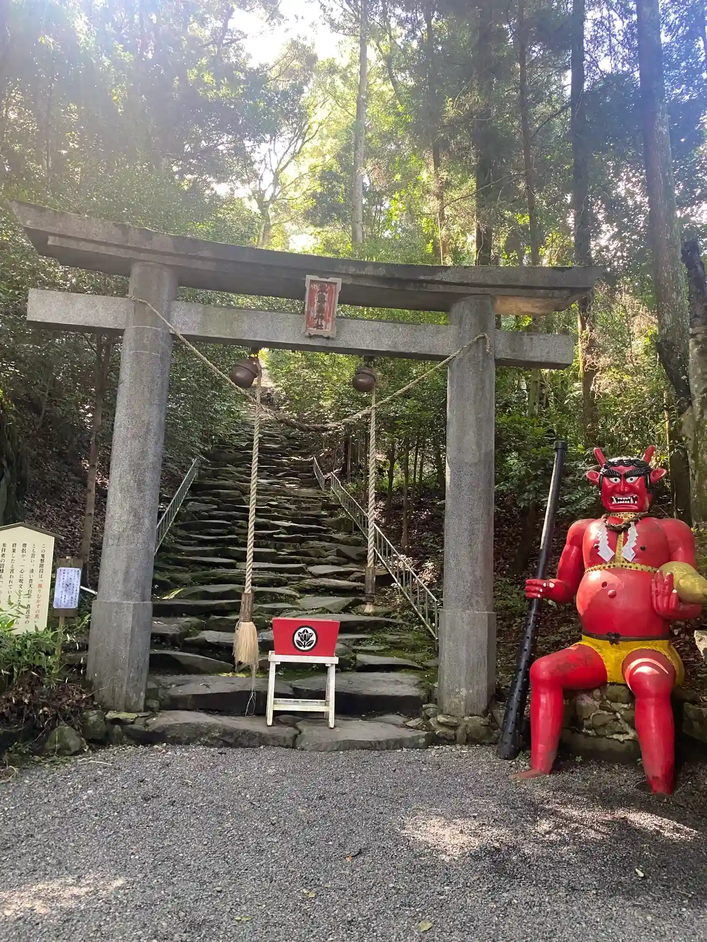 参道の突き当り、「鬼岩階段」のスタート地点にある<二の鳥居>。脇には「赤鬼」が座っている。