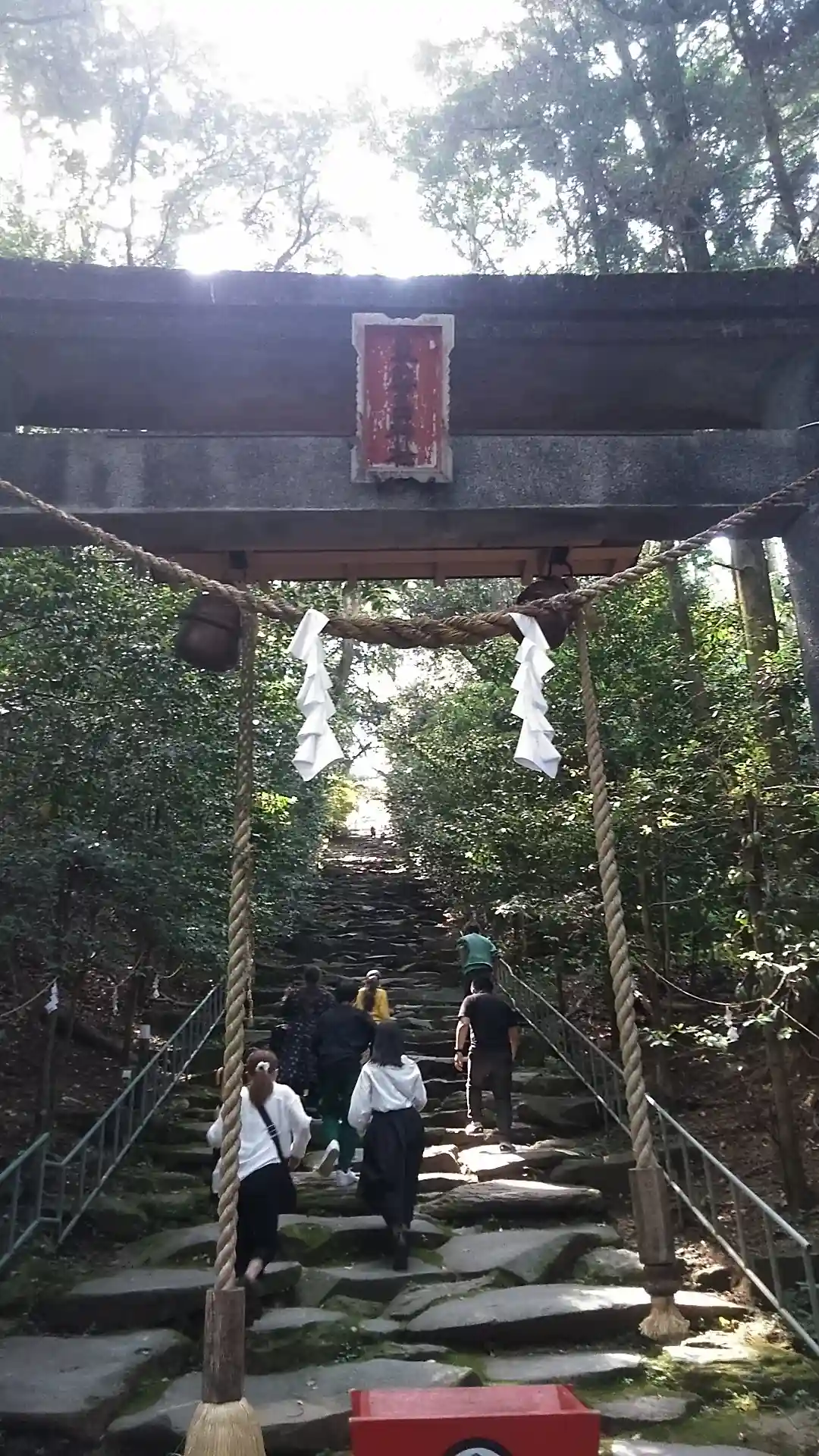 鳥居をくぐって<鬼岩階段>を見上げる。写真だとすごそうに見えないが、実際には急な岩の階段が延々と続いているように見える。