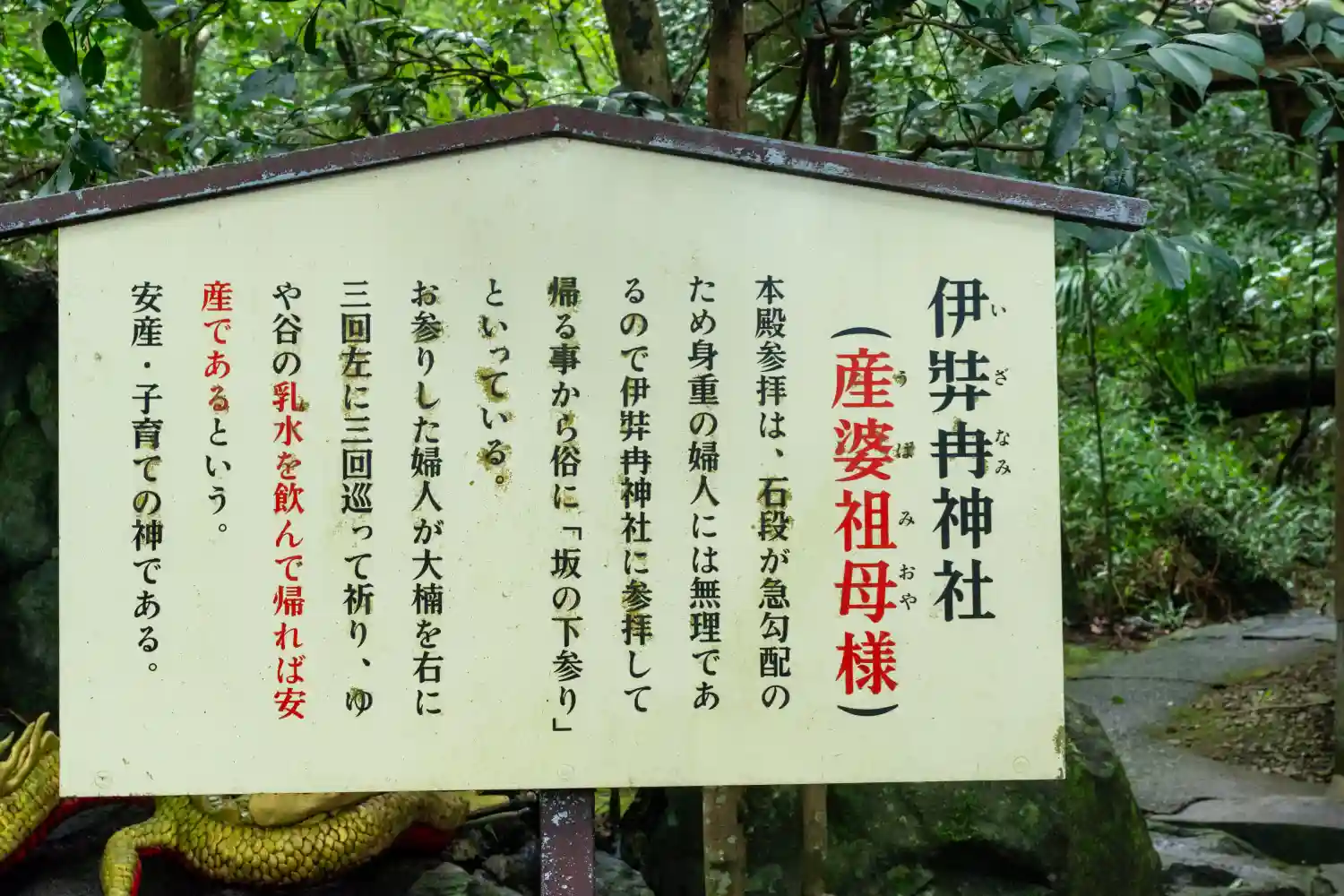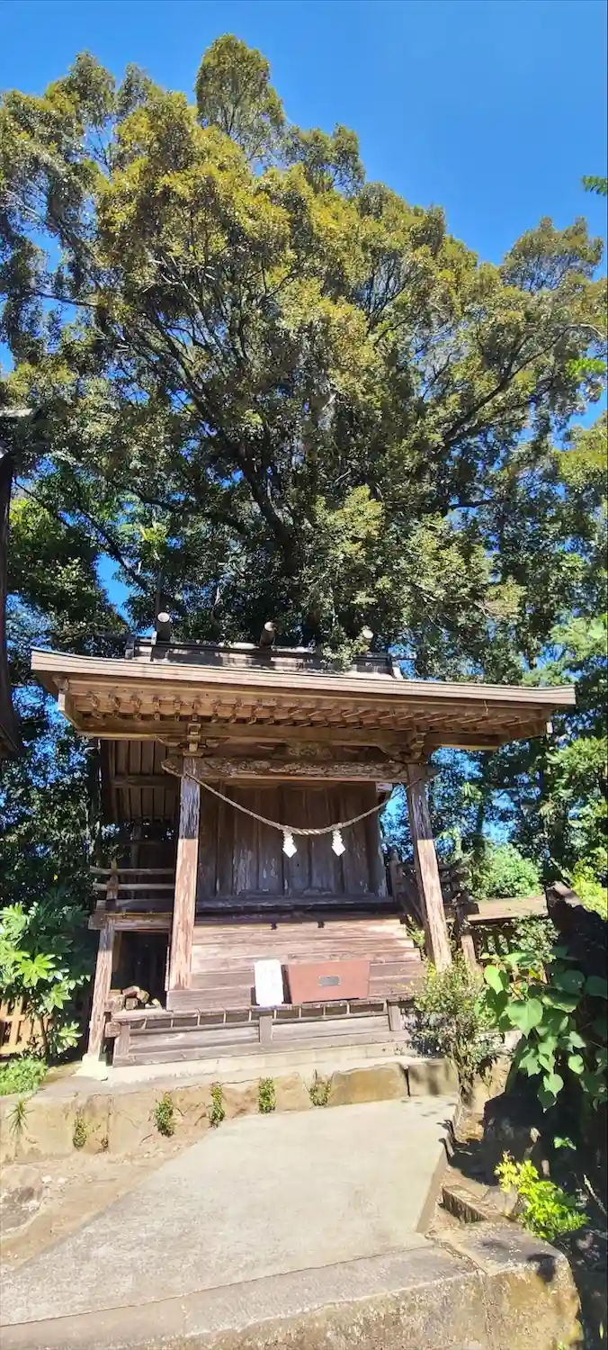 大楠の隣にある境内社<伊弉冉神社>。当社石段は急勾配であるため、妊婦に安産の御利益があるよう「坂の下参り」という習慣が生まれたとのこと。