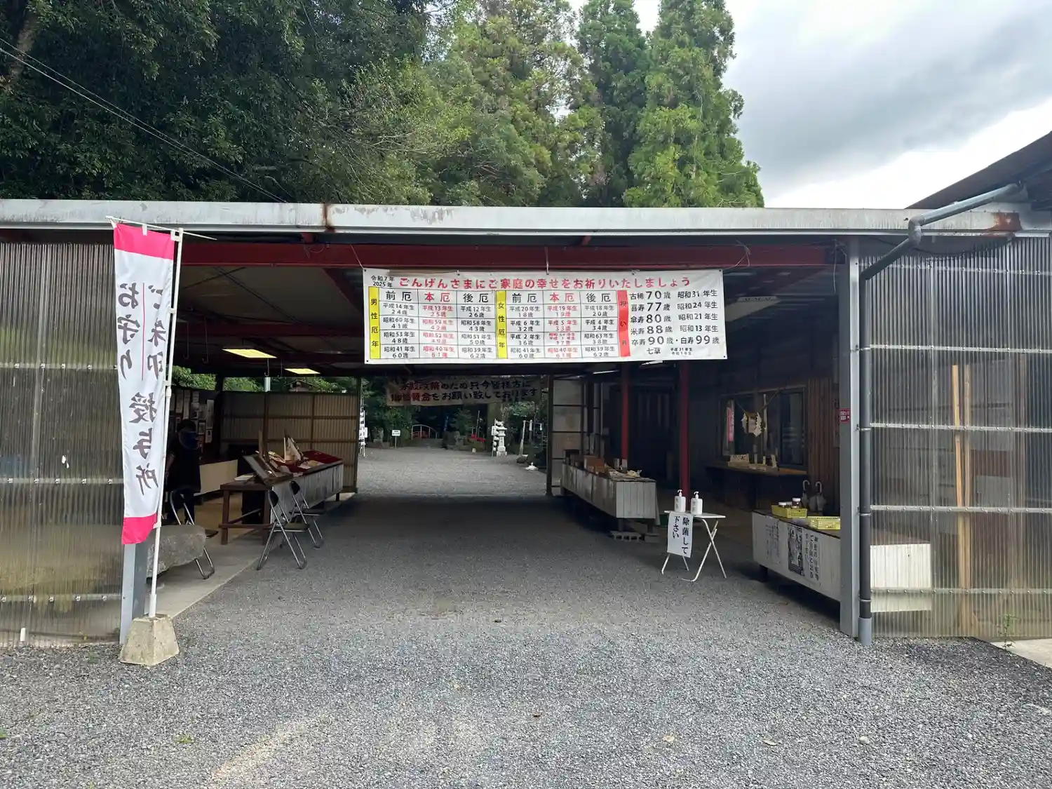 参道の両側に<授与所>の建屋があって、その間が屋根で繋がっている。