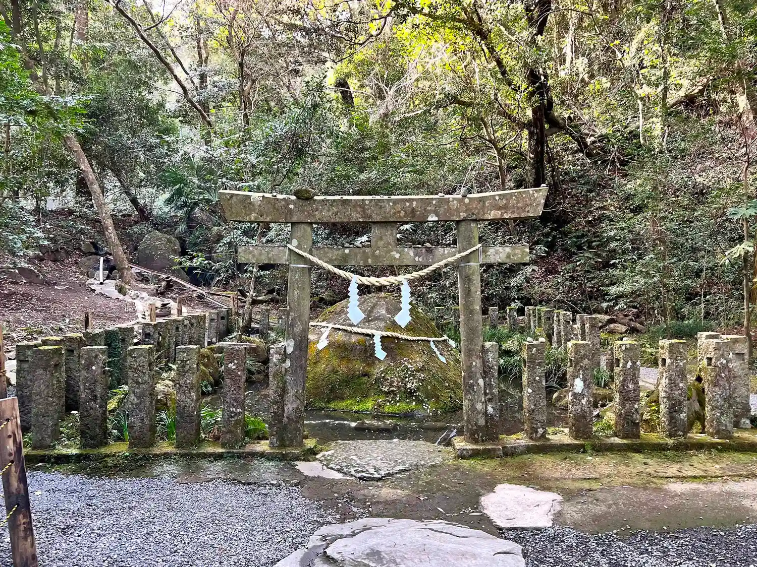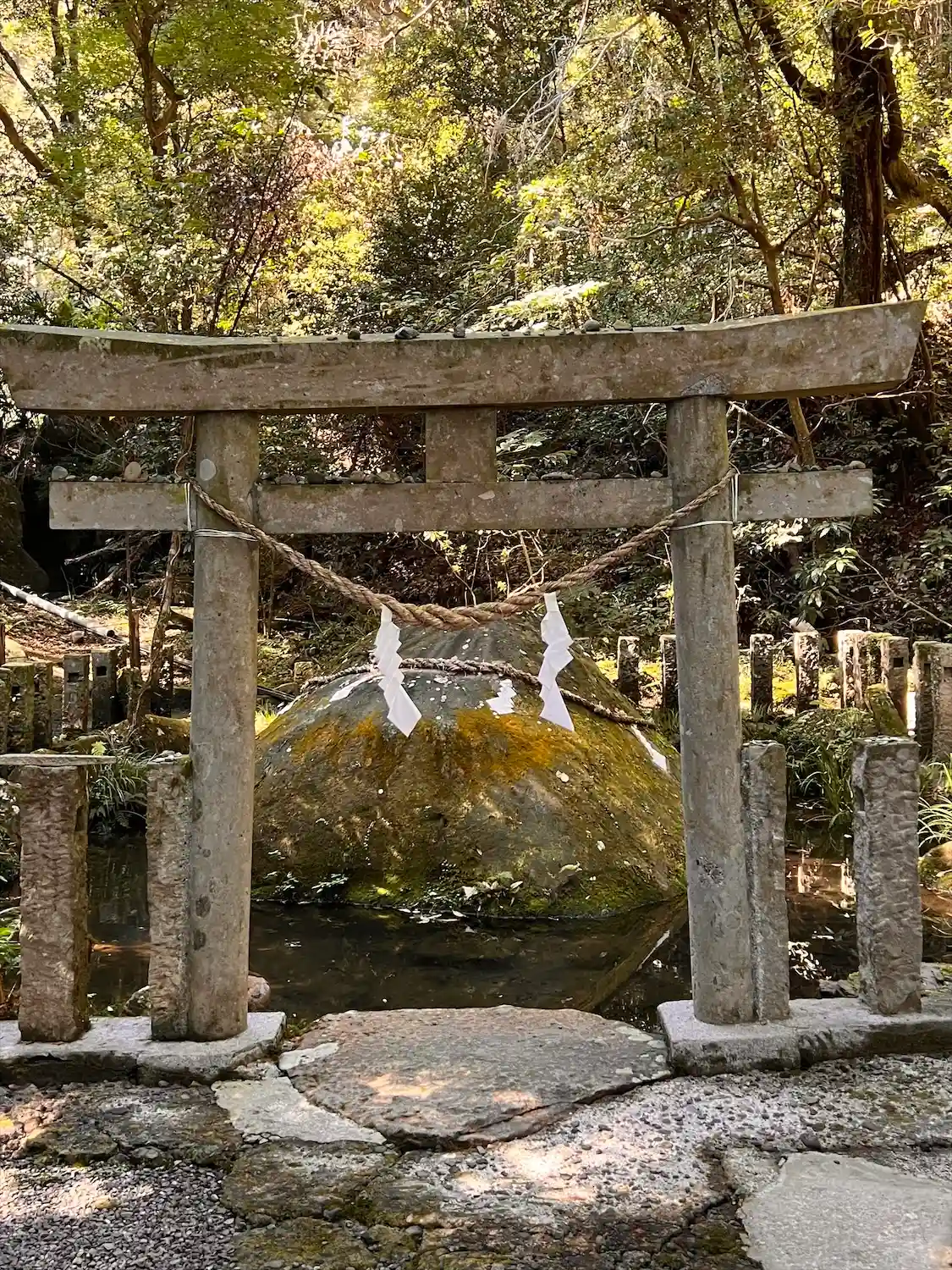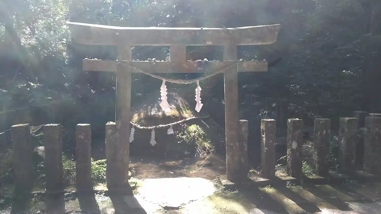 こちらは<神石>。伊弉諾尊が、亡き妻・伊弉冉尊を想って「十握(とつか)の剣」で三段に切ったと伝わる。
