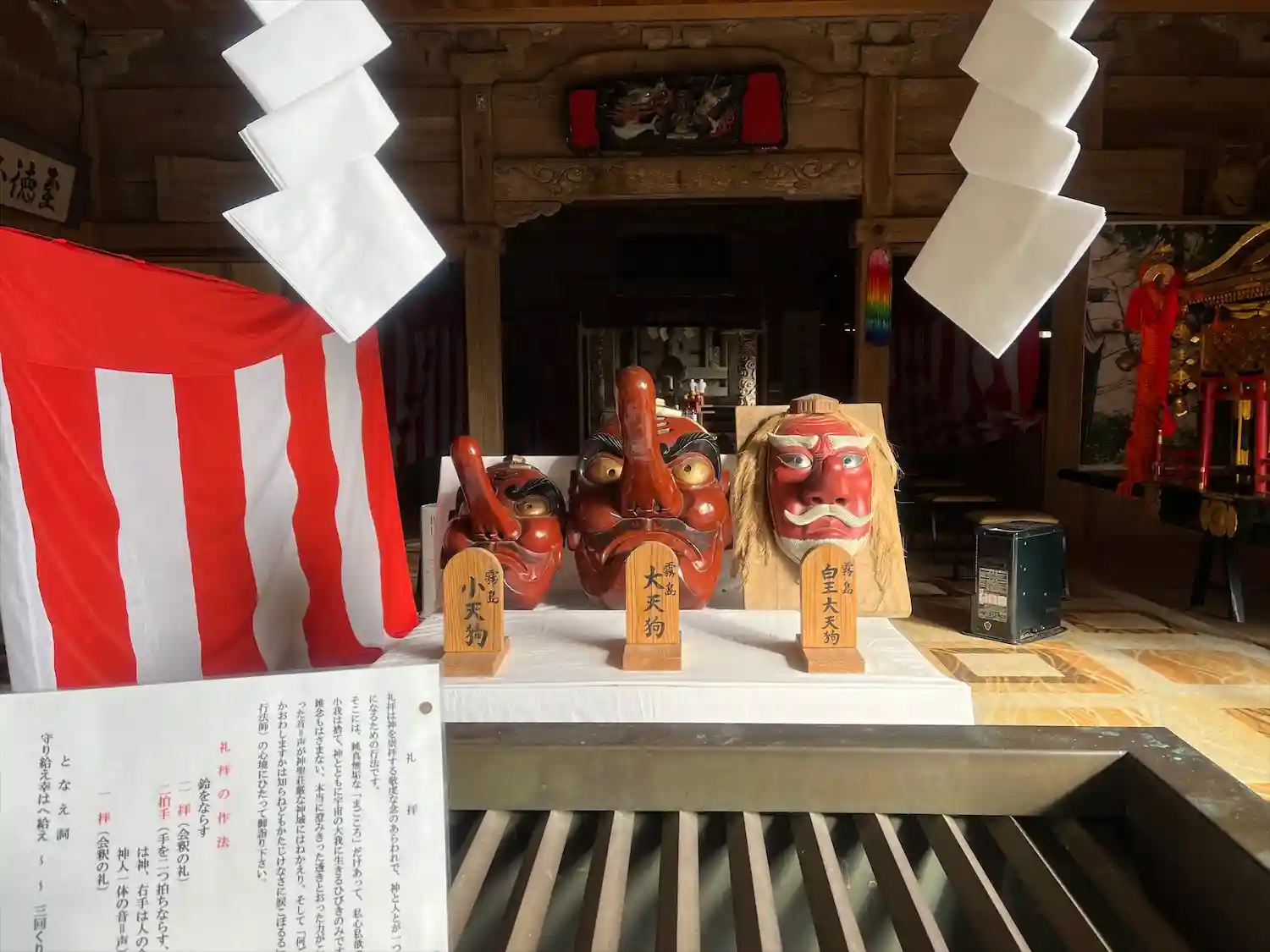 <拝殿>内部。賽銭箱のすぐ後ろに、立派な<天狗の面>が飾ってある。