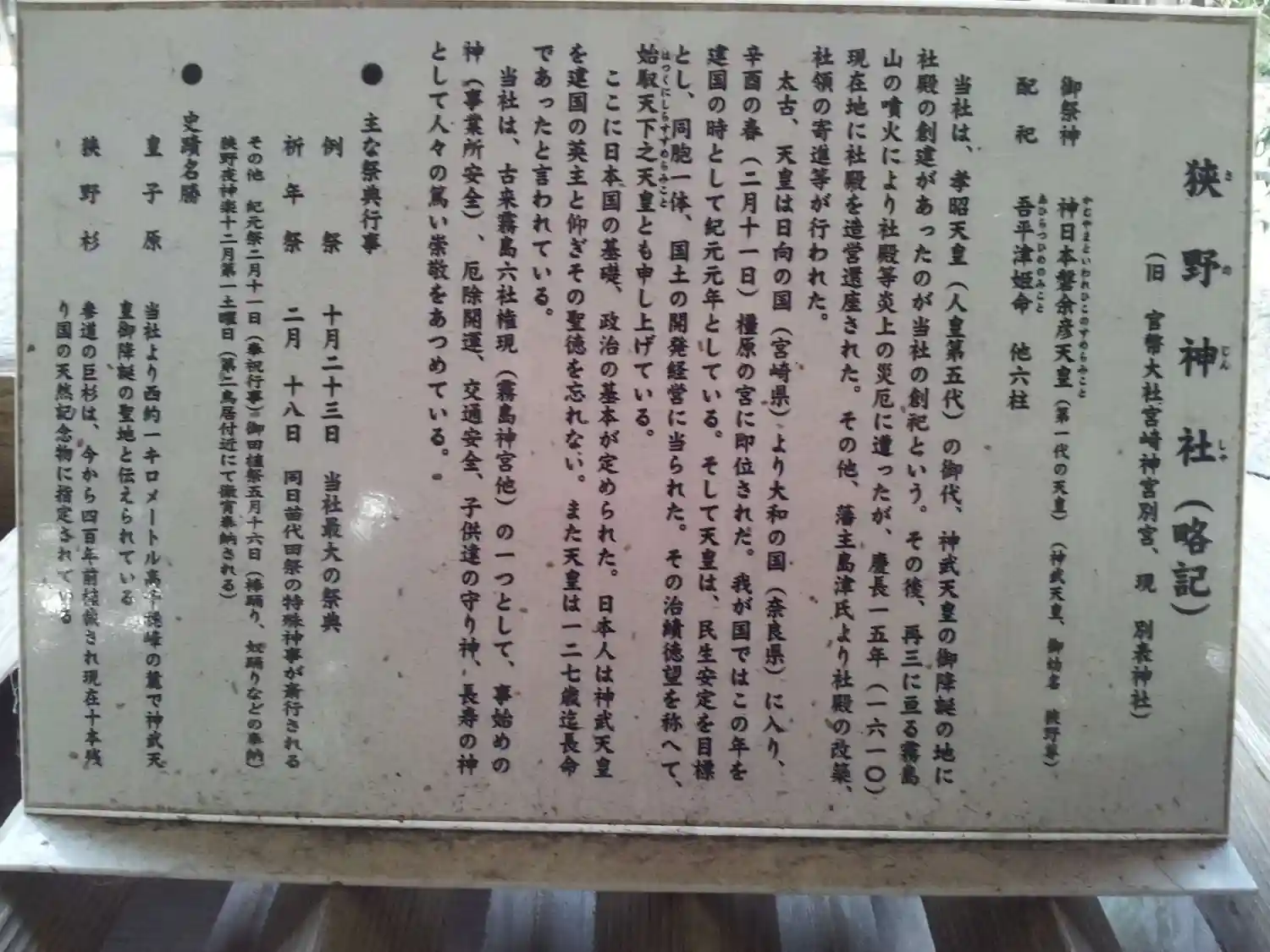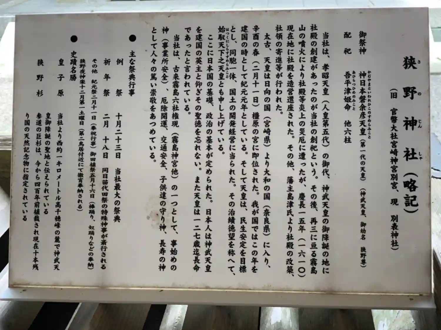 | ご由緒 | 社伝によれば、第五代孝昭天皇の御代に神武天皇御降誕の地に創建されたと伝えられています。当社より西方一キロの霊跡に末社皇子原神社が鎮座し産場石と呼ばれる神石が奉齋されています。御祭神生誕の折に産湯をお取りになられたと伝承され今猶安き出産を齎して戴けると伝えられます。また霊峰高千穂の峰周辺には皇子川原、祓川、血捨の木、宮の宇都、鳥居原等の神武生誕にまつわる地名が残され御祭神のご生業を物語っています。神武天皇さまは御齢十五才を迎える迄、此の地で天下広く統治すべく天壌無窮の御心を培われ御東征の後、奈良県橿原の宮居にて初代の天皇となられました。 当社は高原町の南西部に位置し霧島連峰の麓に鎮座するため幾多の火山噴火の災禍に見舞われた歴史があります。御生誕より数えて第五十代、桓武天皇(延暦七年・七八八年)七月の、高千穂霧島嶽噴火以後幾度も難に遭いつつ、文暦元年(一二三四年)の噴火においては霧島山烈火の如く鳴動し熱石を降らし社殿等を悉く焼亡に至らしめ、高原町西麓の地に仮殿を設け遷奉がなされました。霧島山の噴火も治まった慶長十五年(一六一〇年)には、新たに社殿を造営し元の狭野の地に還御なされました。記憶に新しいところでは、平成二十三年一月二十六日霧島連峰新燃岳が再三に亙り噴火し、小林市霧島岑神社に暫し遷御いたしました。 旧社領地は東西二千間・南北一千間に迄及ぶとされ、歴代の薩摩藩主島津氏より尊崇篤く社殿の寄進等も度々行われました。文禄年間の豊臣秀吉公朝鮮の役では、島津義弘公出陣に際し戦勝祈願がなされ凱旋の後、慶長五年(一六〇〇年)祈願奉賽として重臣新納武蔵守忠元を遣わし境内全般に杉を植栽しました。大正十三年には狭野の杉並木として国の天然記念物に指定され、現在も境内に鬱蒼として聳える杉並木として残っています。明治六年県社に列し、大正四年には官幣大社宮崎神宮の別宮に指定されました。また第三十代敏達天皇の御代より別当寺を創立し、金剛仏作寺神生院の勅号を賜りました。後に霧島仏華林寺神徳院と称するようになり、霧島修験道の大寺として信仰されていました。慶応二年廃仏毀釈により廃寺となりましたが、歴代の住職を中興の祖と仰ぎ神徳院墓地を創設し祀っています。高千穂峰近在に鎮座する霧島六所権現(当社・霧島神宮・霧島岑神社・霧島東神社・東霧島神社・夷守神社)の一社としても数えられています。