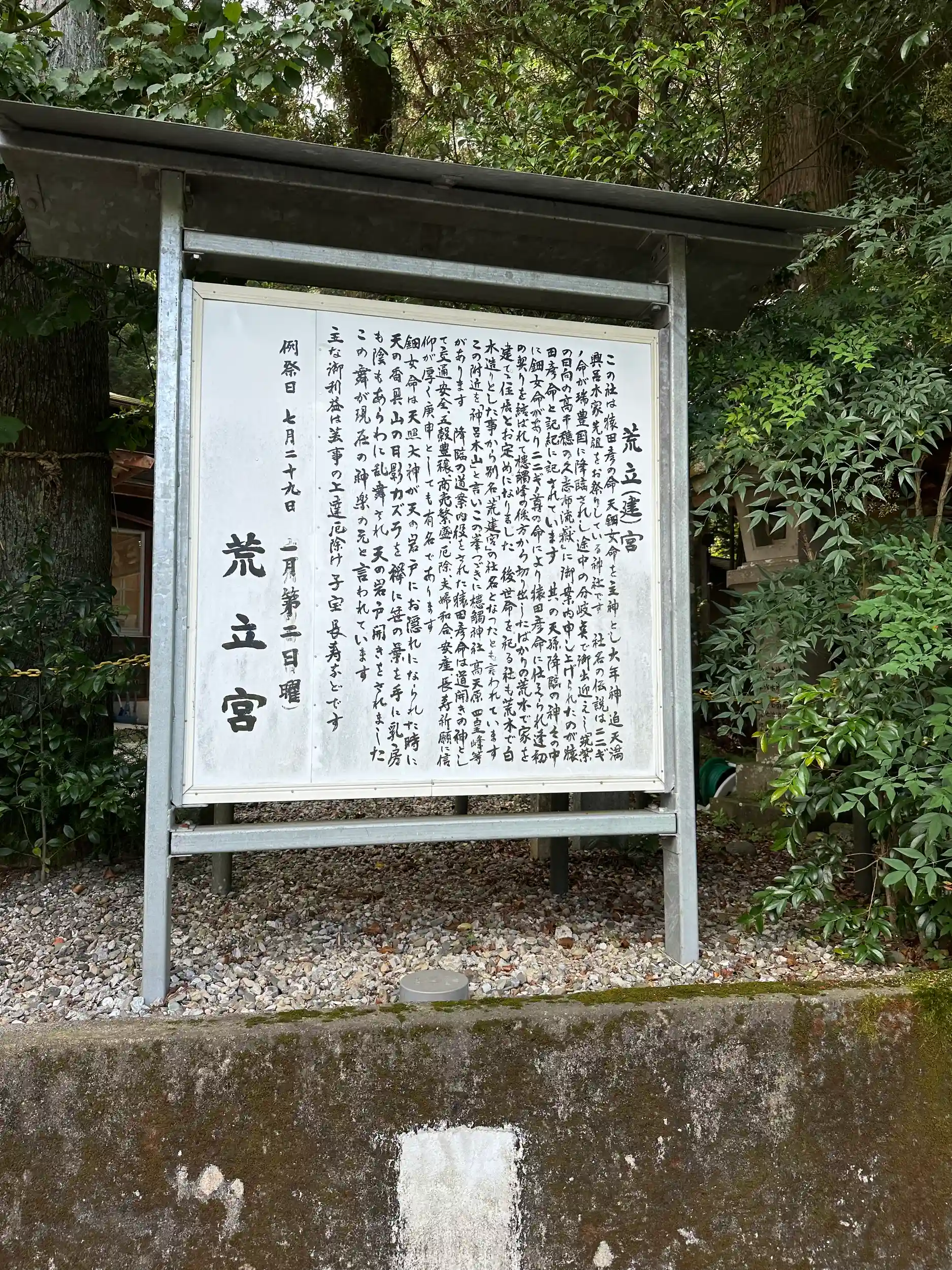 瓊々杵尊(ににぎのみこと)が天照大神の命を受けてこの国に降臨される途中で天孫一行を道案内をされた猿田彦命(さるたひこのみこと)と天鈿女命(あめのうずめのみこと)が結婚して住まわれた地と伝えられ、切り出したばかりの荒木を利用して急いで宮居を造ったため、荒立宮と名付けられたといわれています。