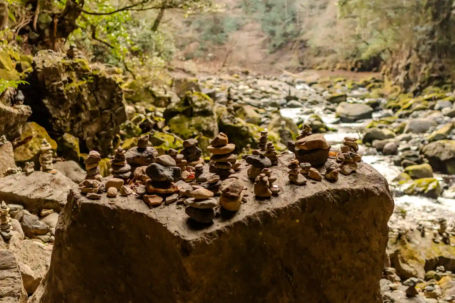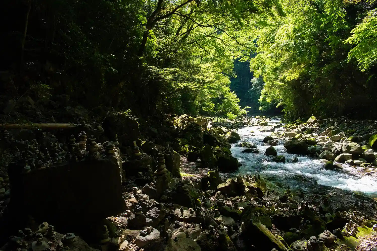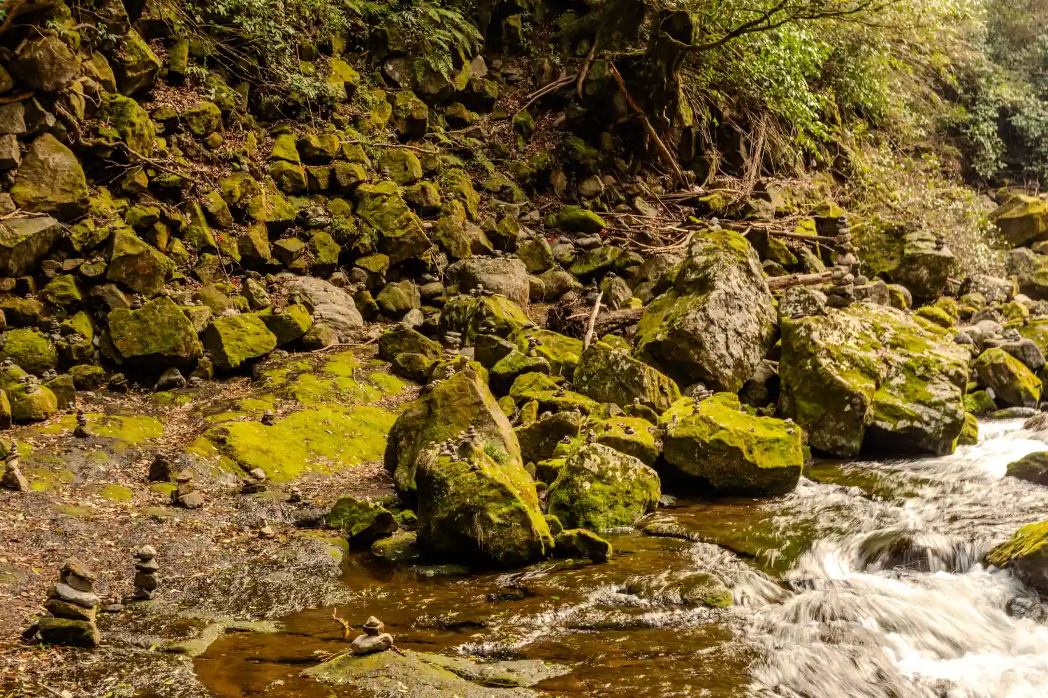 岩戸川沿いに積まれた無数の石