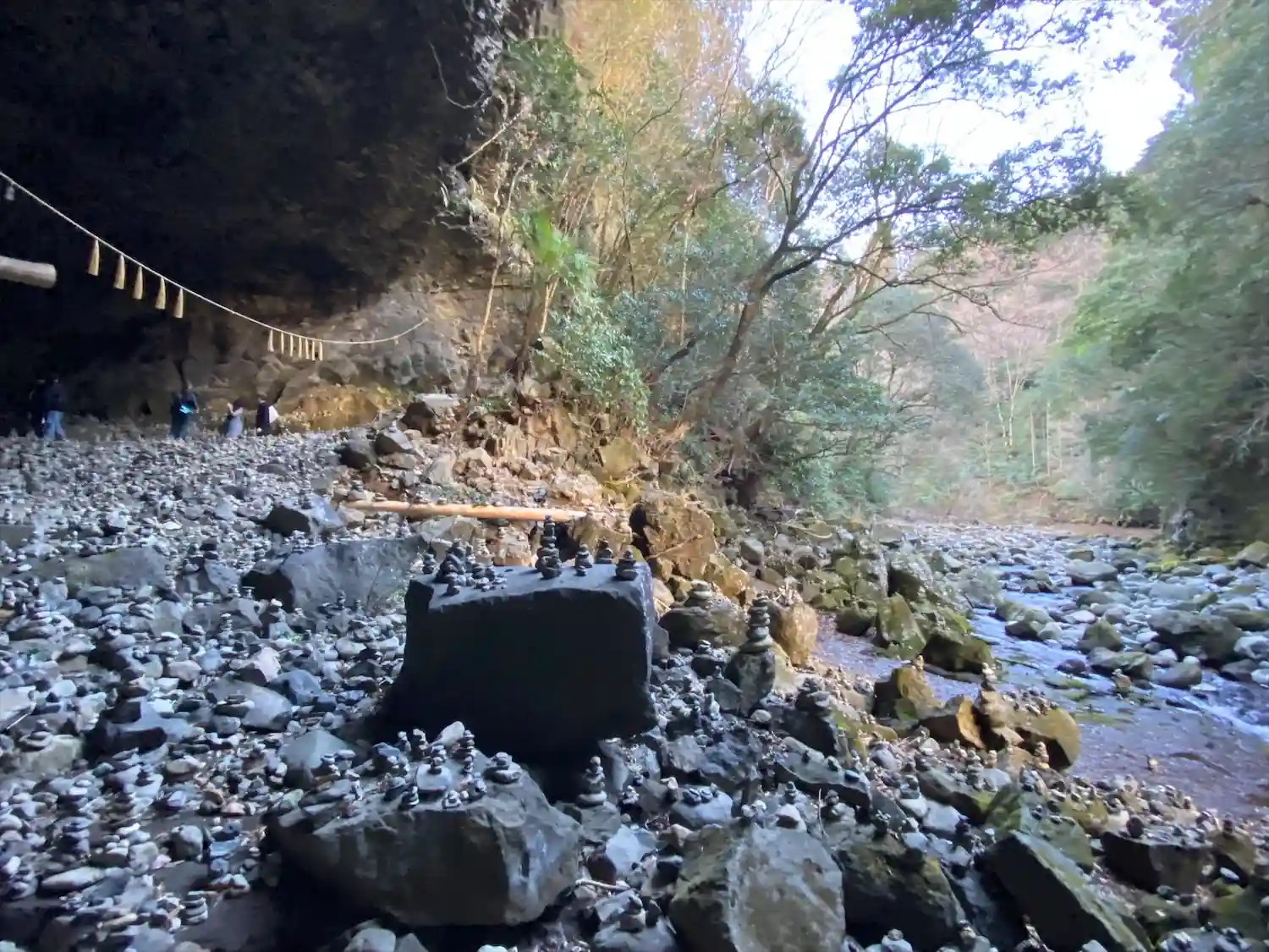 天安河原宮の前の河原。大きな岩がごろごろ。