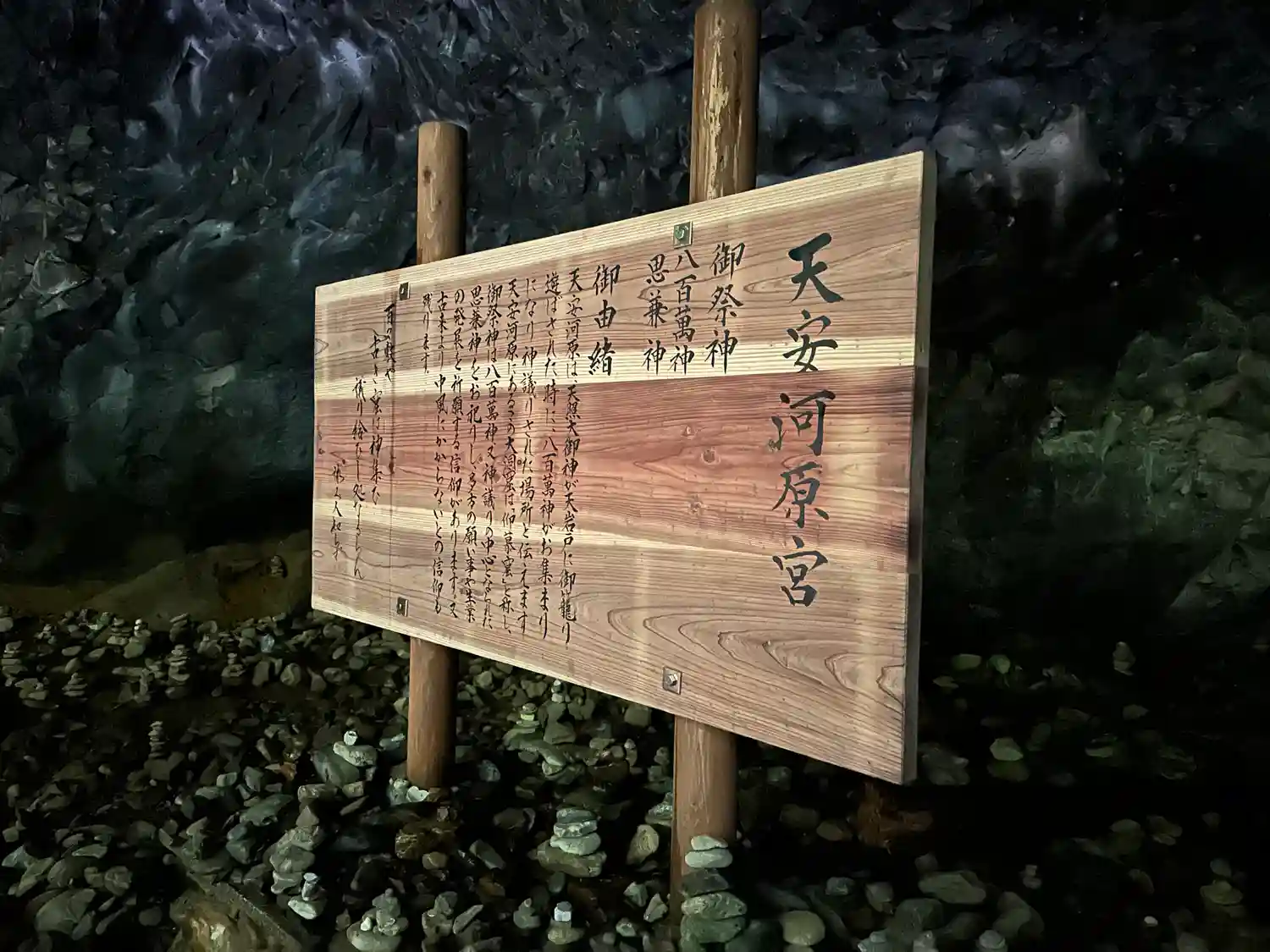 天照大神が岩戸にお隠れになった際、天地暗黒となり八百万の神がこの河原に集まり神議されたと伝えられる…