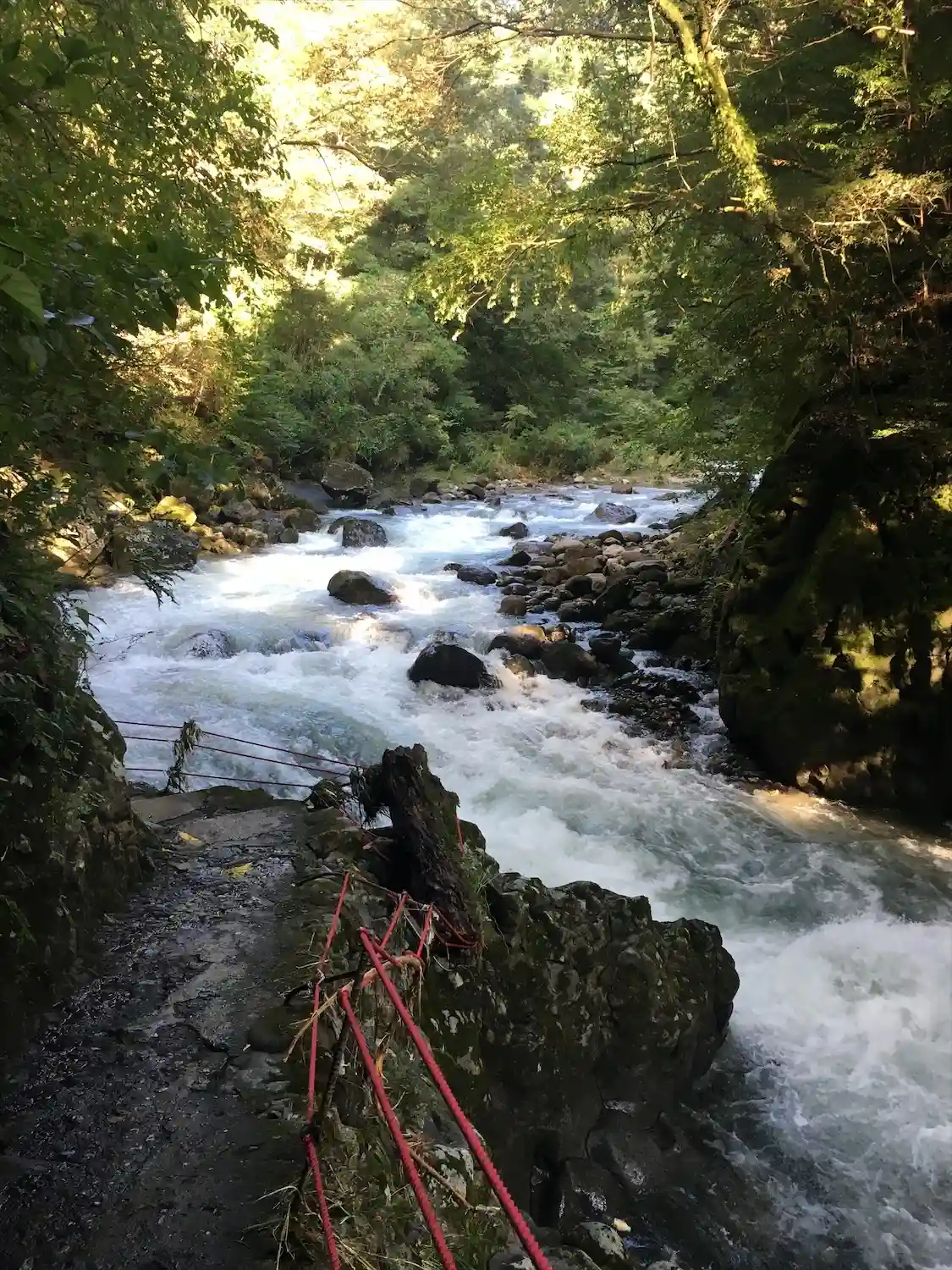 この川のせせらぎ…じゃないな。激流音が逆に涼しく感じます。