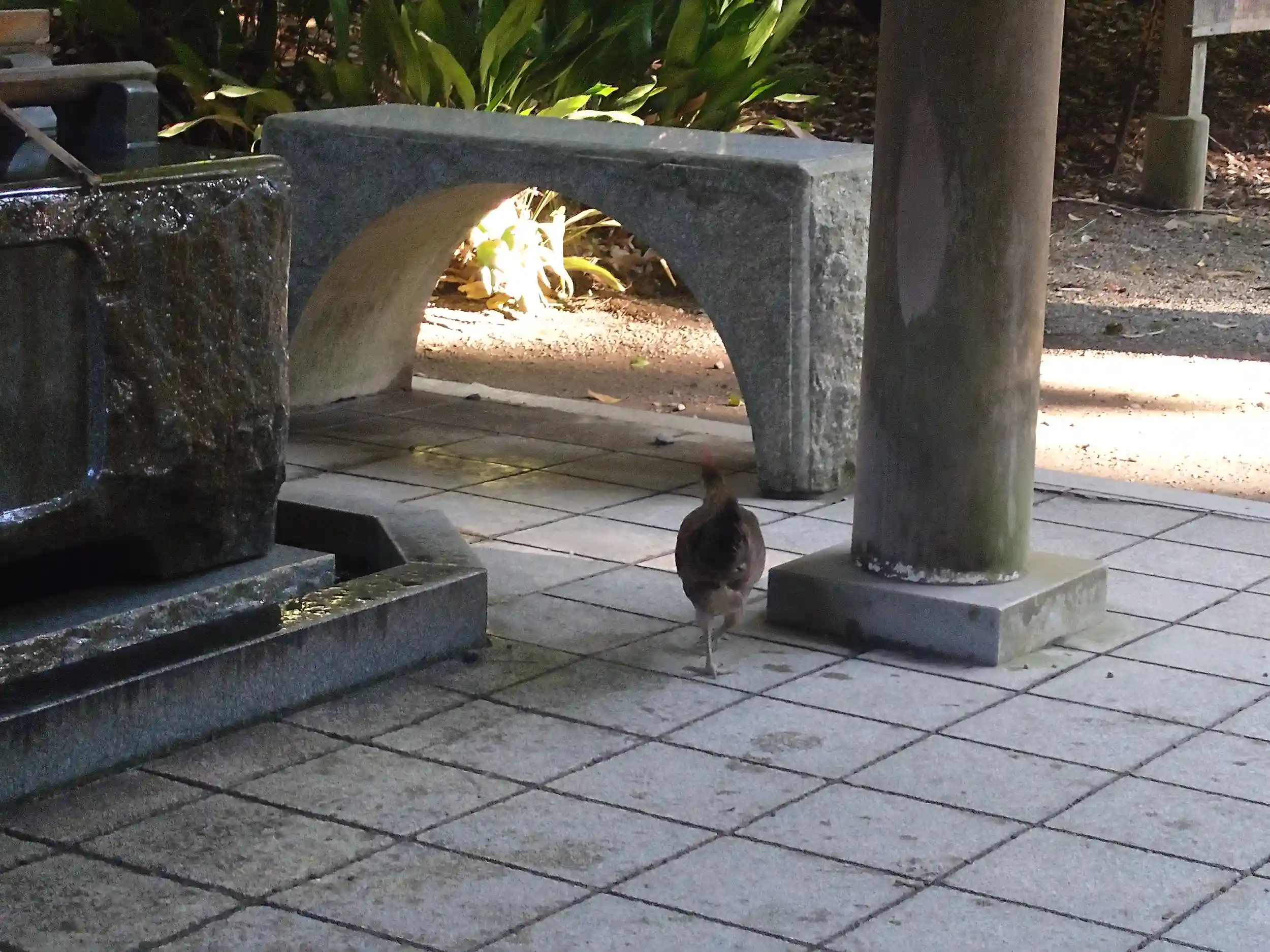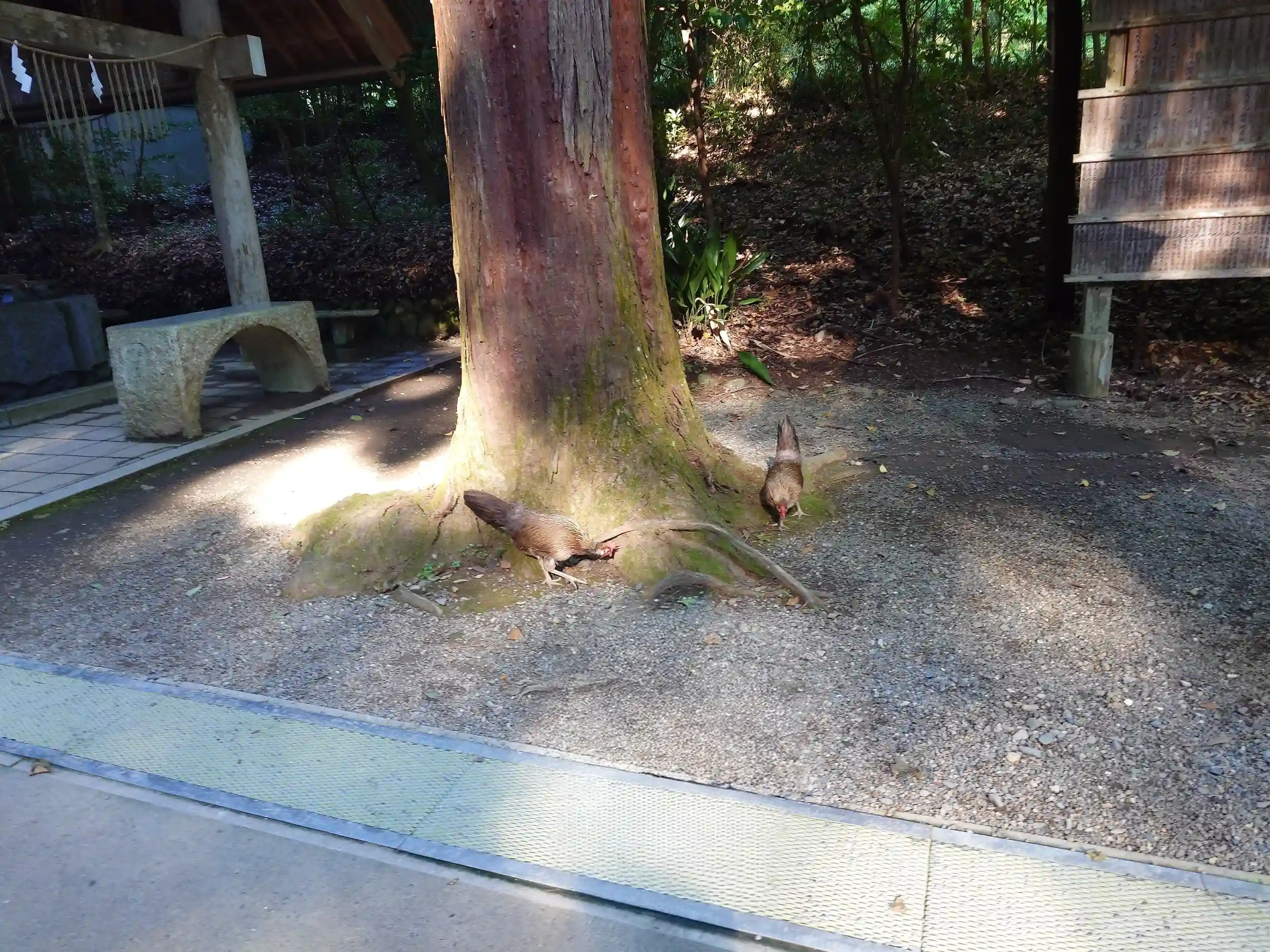 手水舎付近には鶏が顔を出していました。鶏は天照大御神様の御使いとのことですので、お会いできると嬉しいですね。