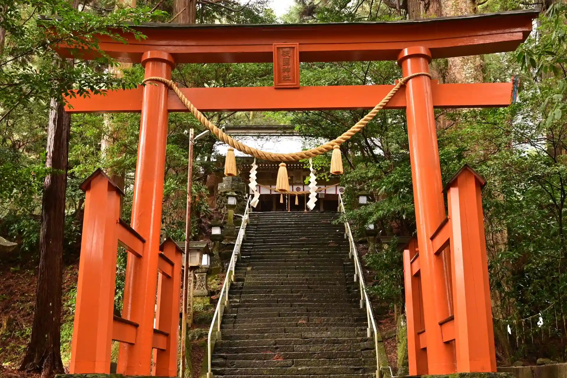 祇園神社は、宮崎県西臼杵郡五ヶ瀬町大字鞍岡に鎮座します。「九州島発祥の地」とされる祇園山を中心とする「知保郷圏域」の鎮守の神様として、第29代 欽明天皇(在位:539-571)の時代に、牛頭曽男神(ごずそおのかみ)・蘇民将来(そみんしょうらい)・巨丹将来(こたんしょうらい)を合祀して「祇園社」として創始されたのが祇園神社の始まりとされます。869(貞観11)年、全国で疫病が流行った時代、山城国(京都)八坂神社から疫病・厄難消除の祈願守護神として素戔嗚大神(すさのうのみこと)を主祭神として勧請し、十一柱の神様を合祀して「八坂神社」と改称しました。昭和になり1935(昭和10)年、「祇園神社」と改称し現在に至っています。