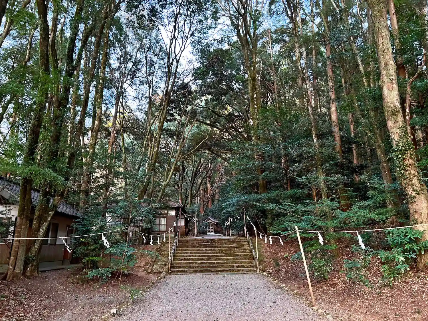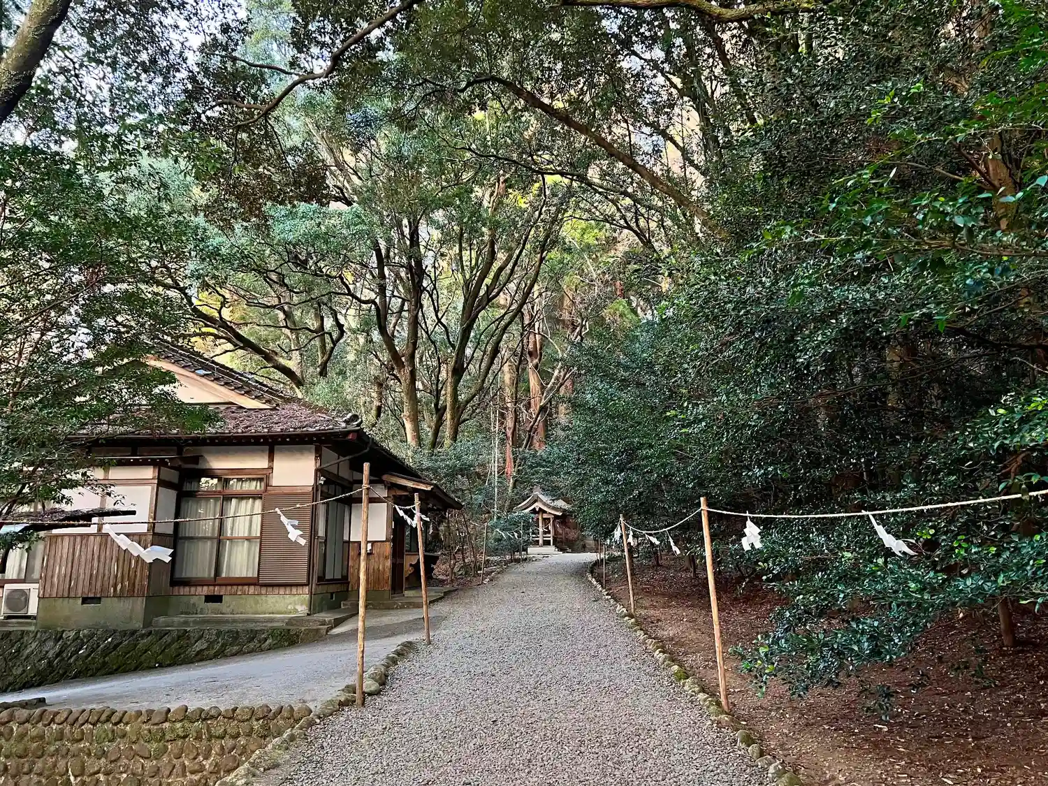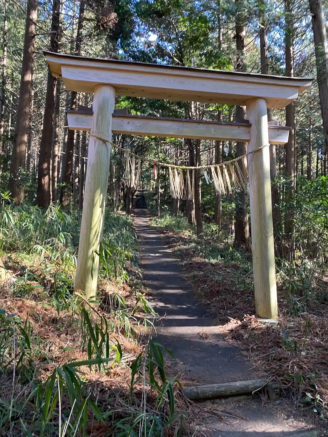 鳥居をくぐって参道を進む。参道は両側を紐と紙垂で仕切られている。