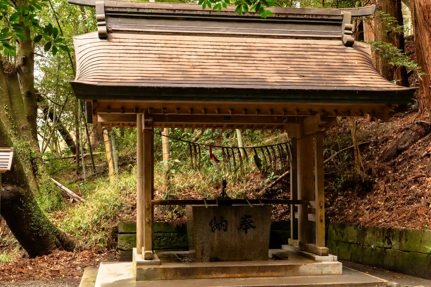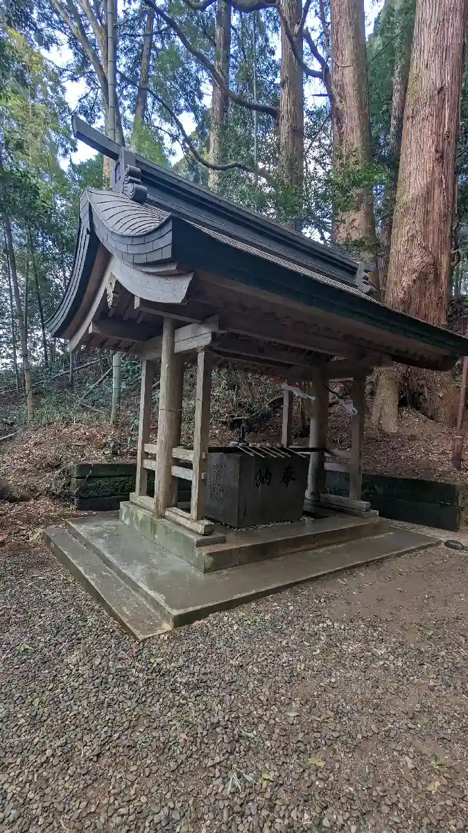 手水舎後方の樹木群が太くて高く、古社らしい抜群の雰囲気。