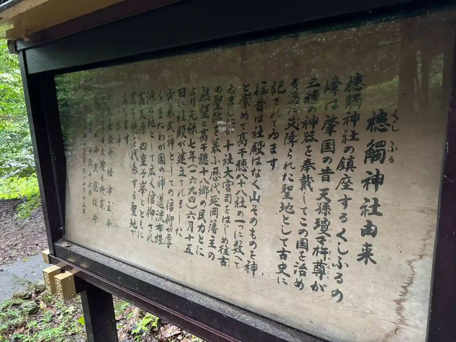 天孫瓊々杵尊の天下り神話として「筑紫の日向の高千穂の久士布流大多気に天降ります」とあり、ふるくは…