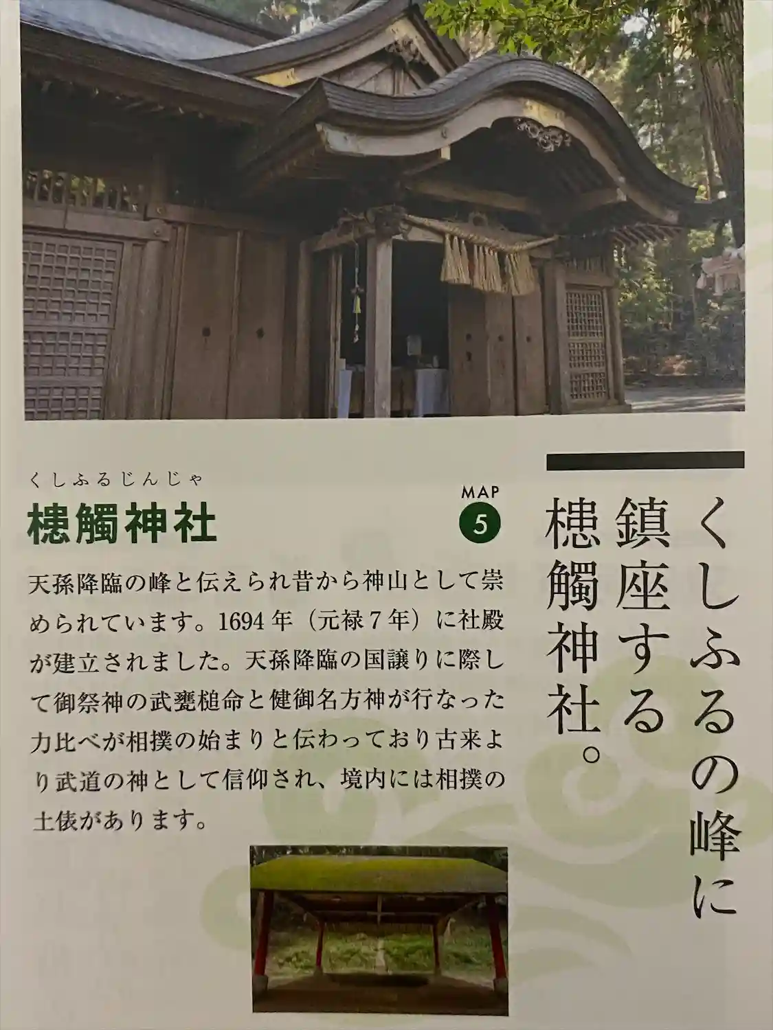 槵觸神社(くしふるじんじゃ, 創建年代不詳) 御祭神は瓊々杵命・天児屋根命・天太玉命・経津主命・武…