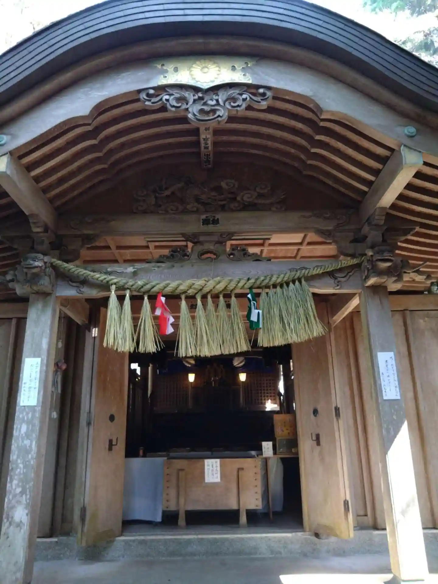 <拝殿>正面。注連縄に赤と緑の紙垂が付けられているのが珍しい。