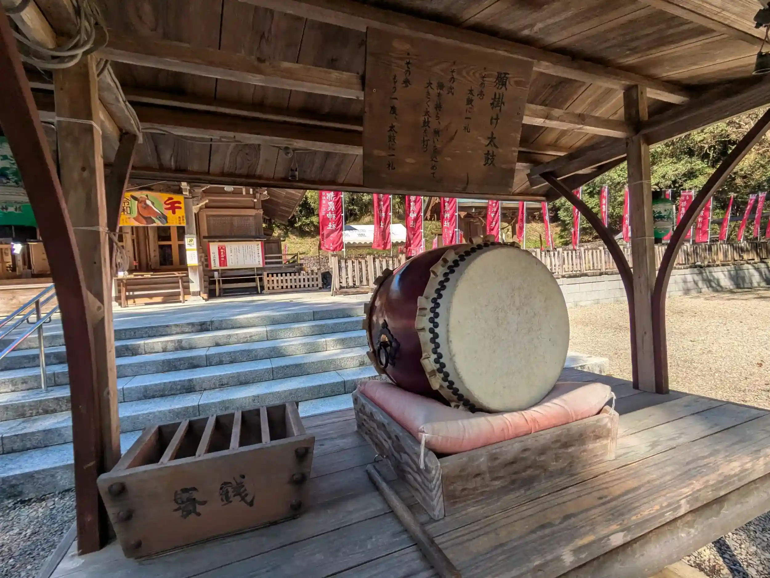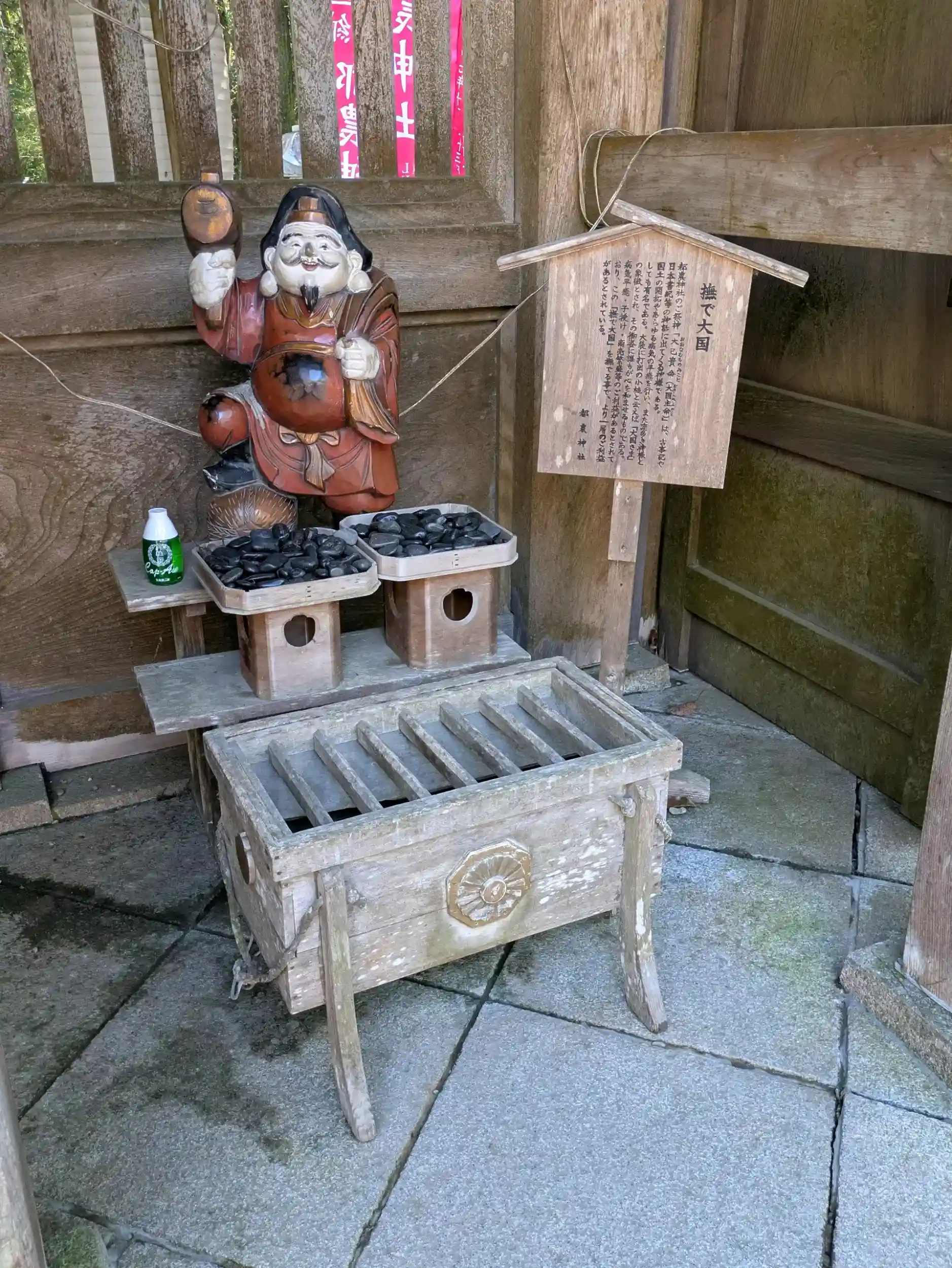 願いの太鼓等があり、3人それぞれ願いを込めて打ち、おみくじを引き、撫でウサギで無病息災をお祈り。