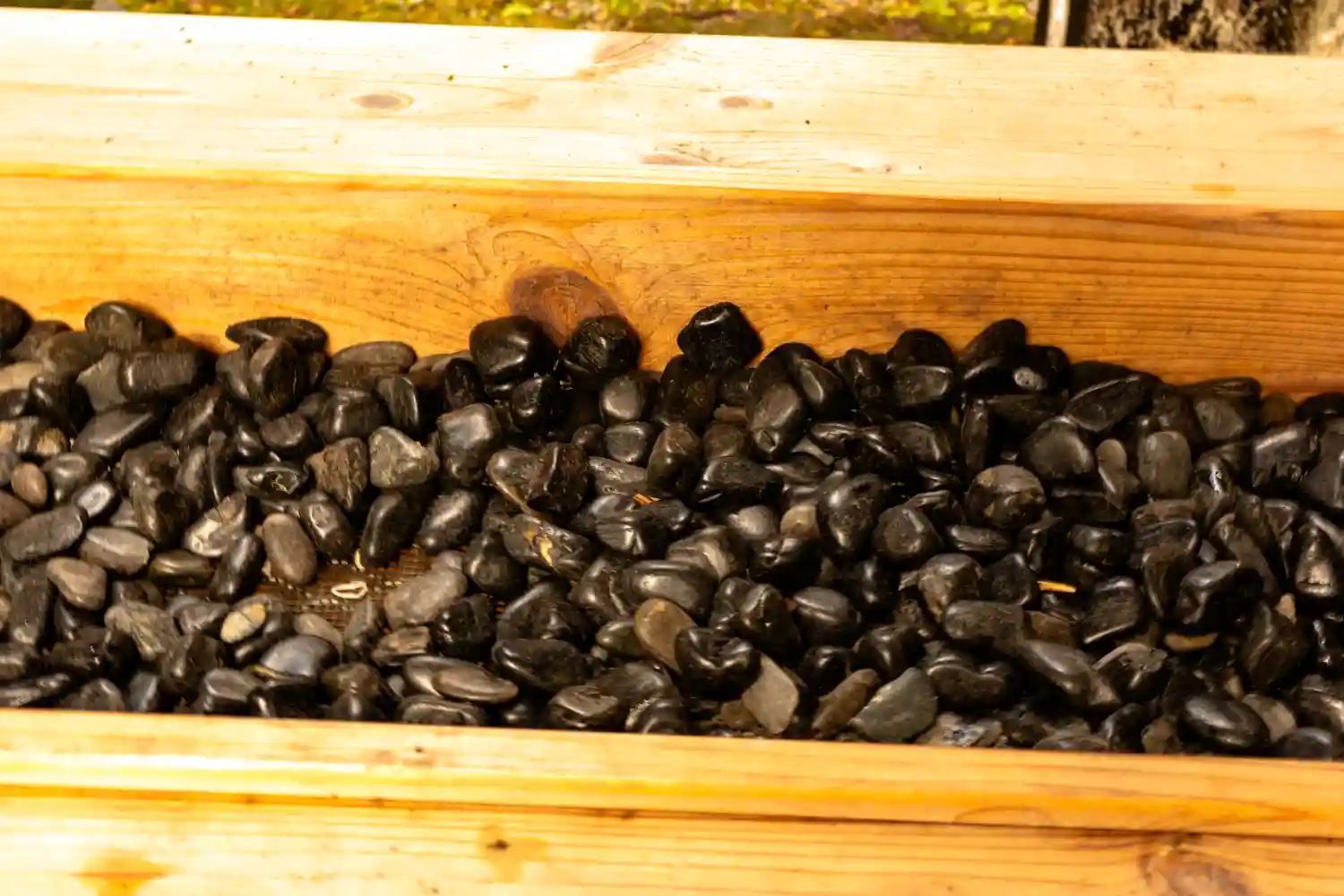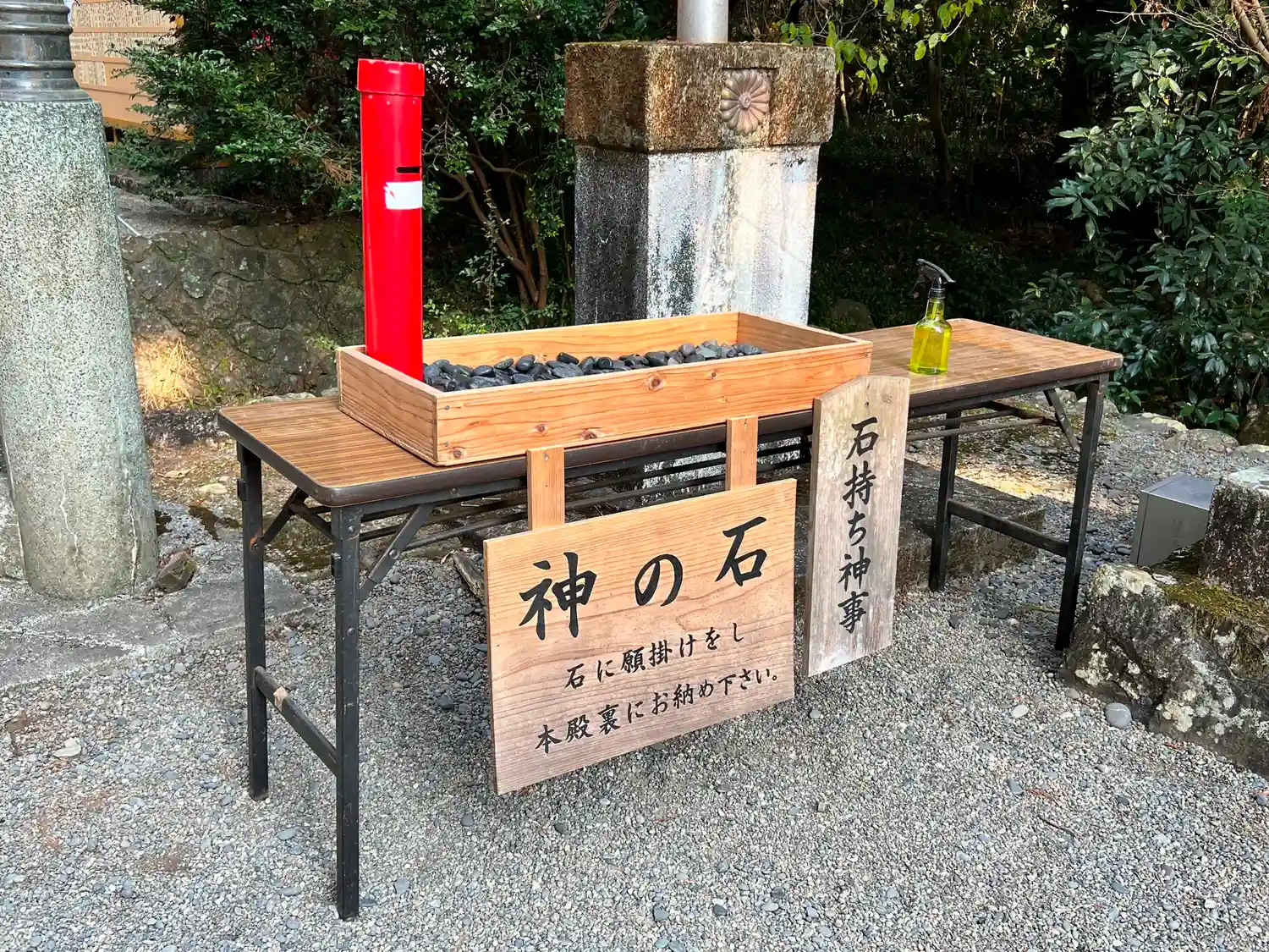 参道進んで、参道右側にある<神の石>。箱の中の石を取って、願掛けをしながら持ち運び、本殿裏に奉納する。