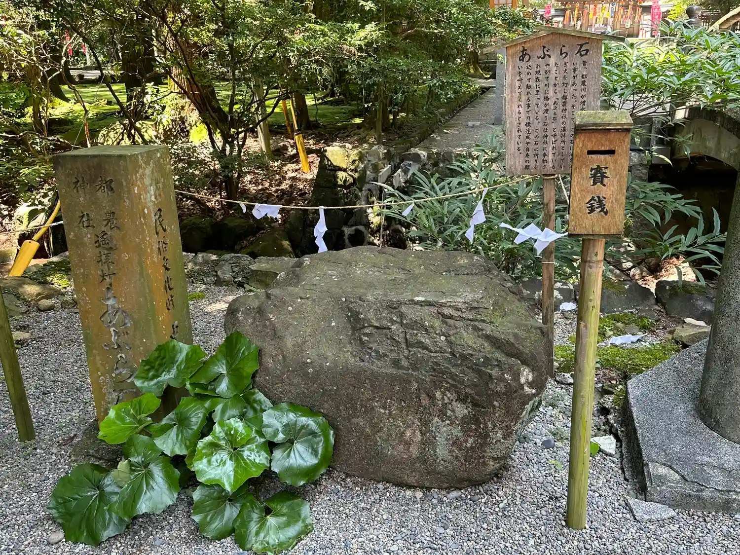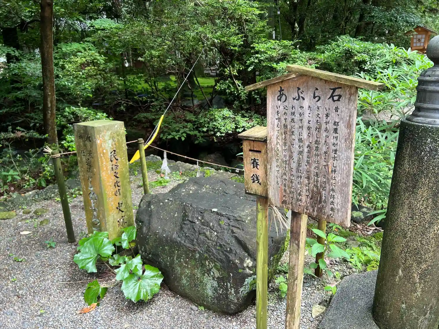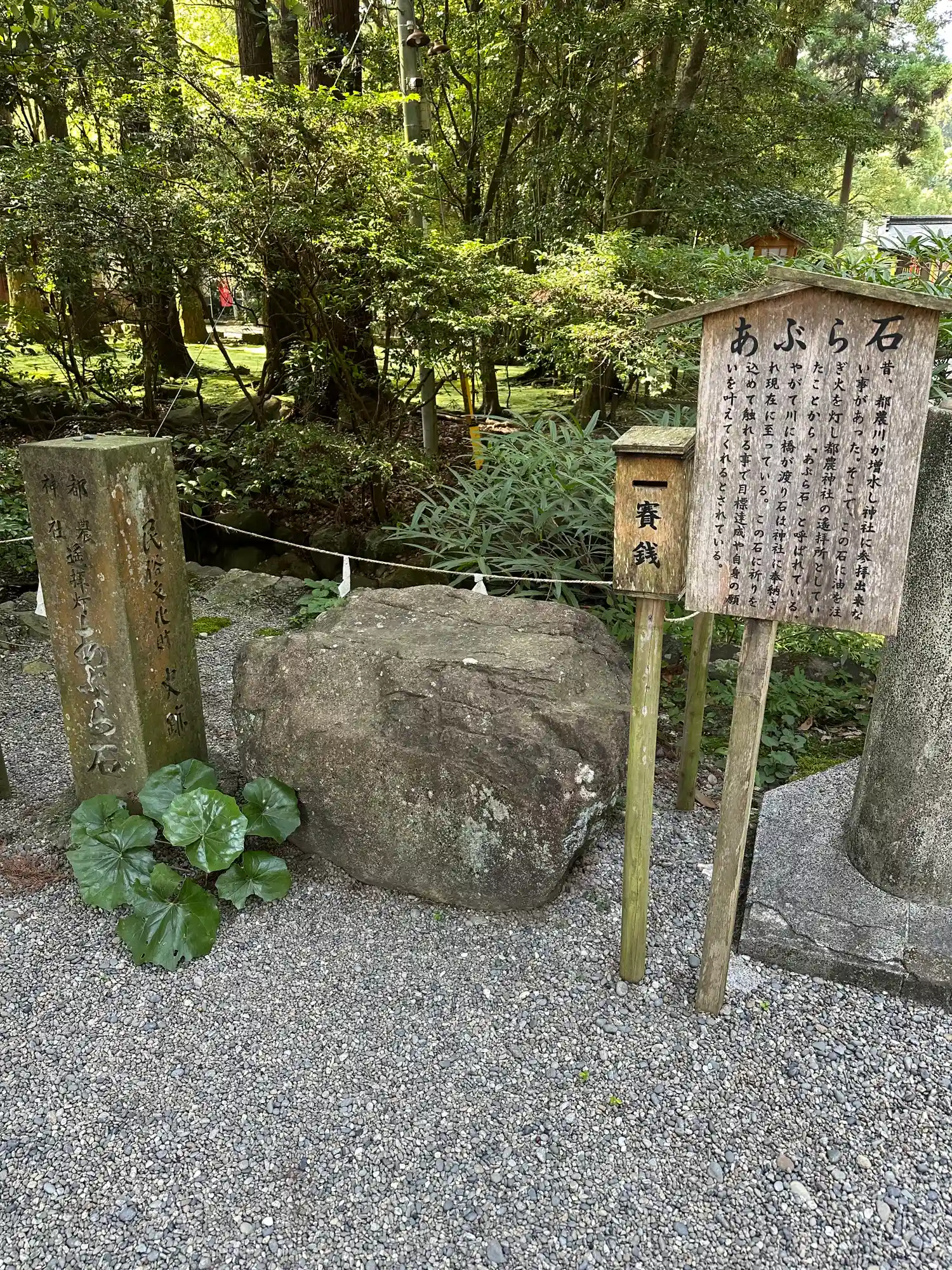 参道右側の<あぶら石>。都農川増水で社殿に参拝できない時、この石に油を注いで火を灯し遙拝所としたとのこと。