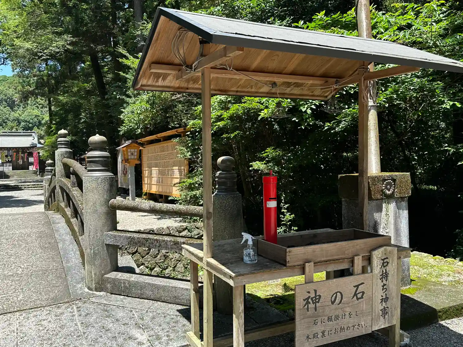 参拝の前に行うおススメ神事が古くから都農神社に伝わる信仰のひとつ「石持ち神事」です。参道にかかる橋のたもとに神事に使う「神の石」が置かれています。御賽銭をあげて石を1つ受け取り、その石をもって本殿前にそなえてお祈りします。