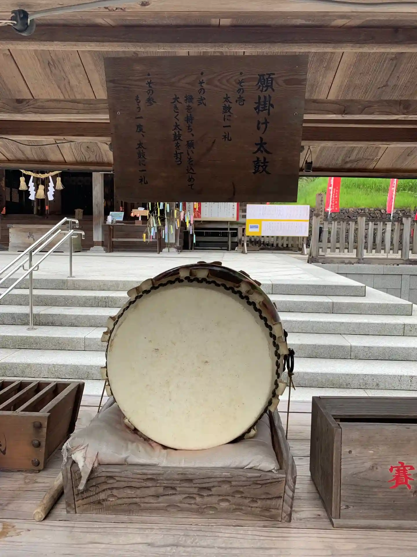 臨時授与所の前にある<願掛け太鼓>。お作法は一礼、一打、一礼。