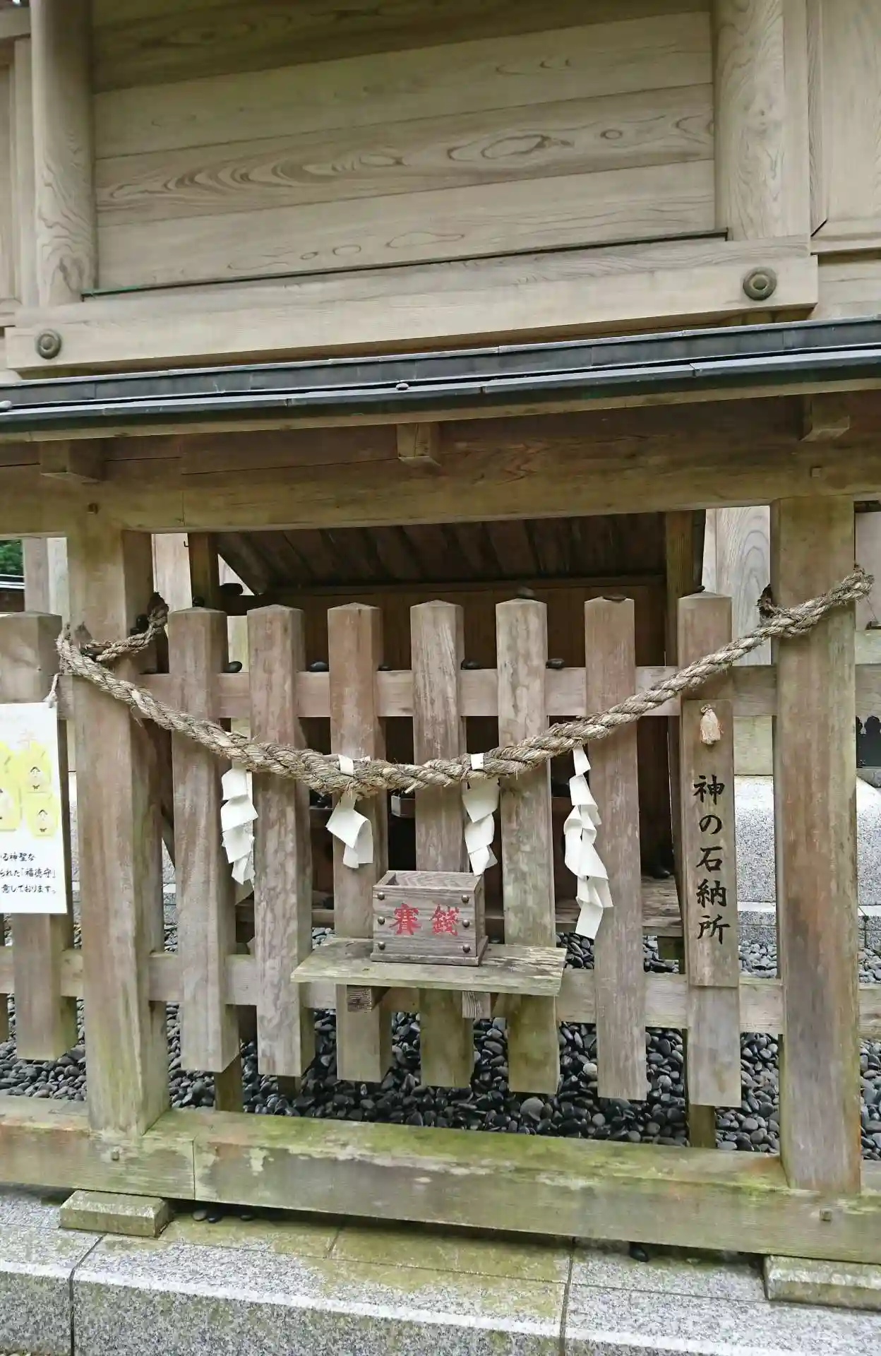 本殿の真後ろにある<神の石納所>。他の神社だと、本殿の後ろまで廻る人は少ないが、当社では多くの人が本殿後ろまで<神の石>を納めに来ていた。