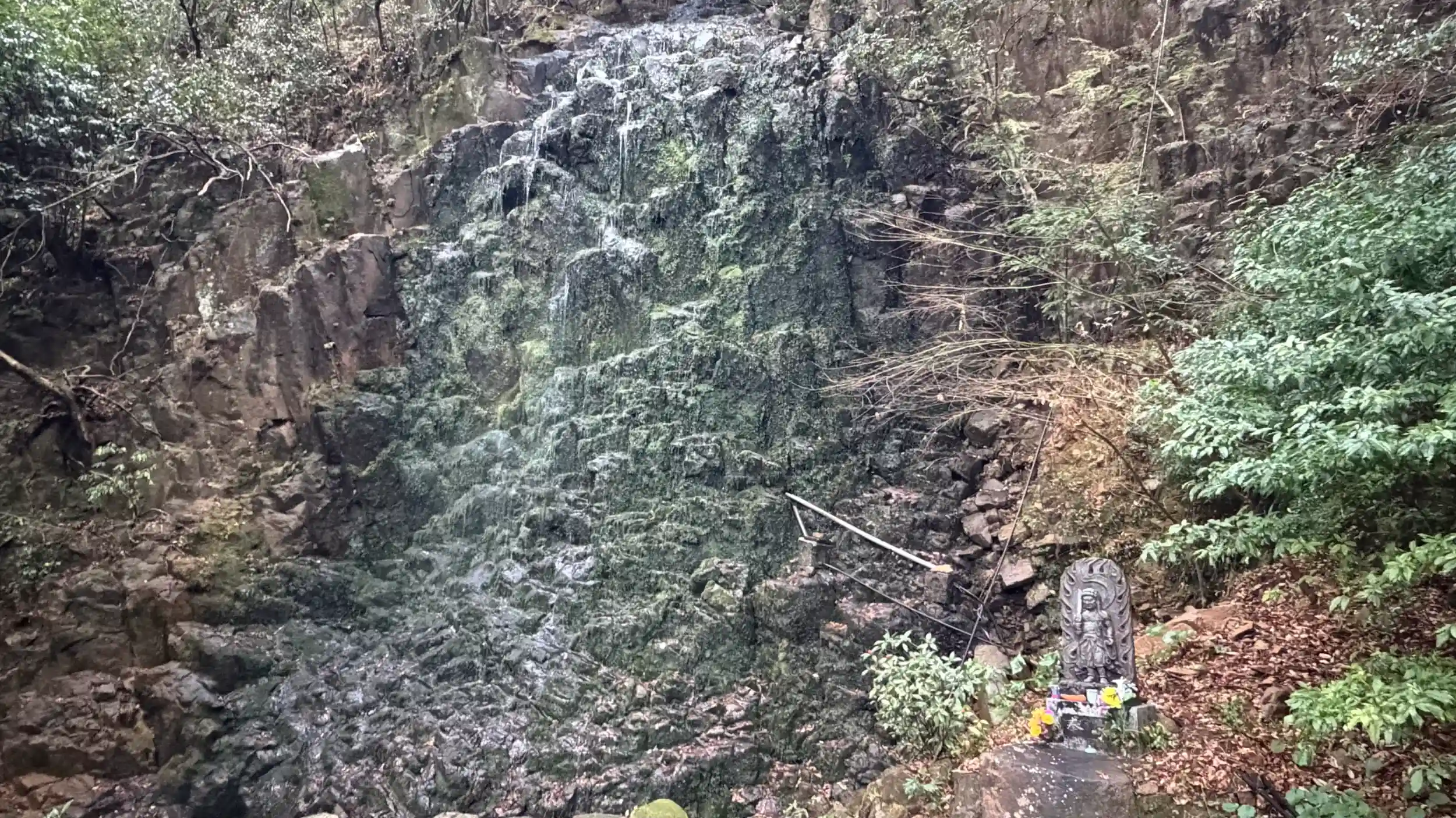 雨上がりの朝一番に参拝。滝の水流はチョボチョボでした。