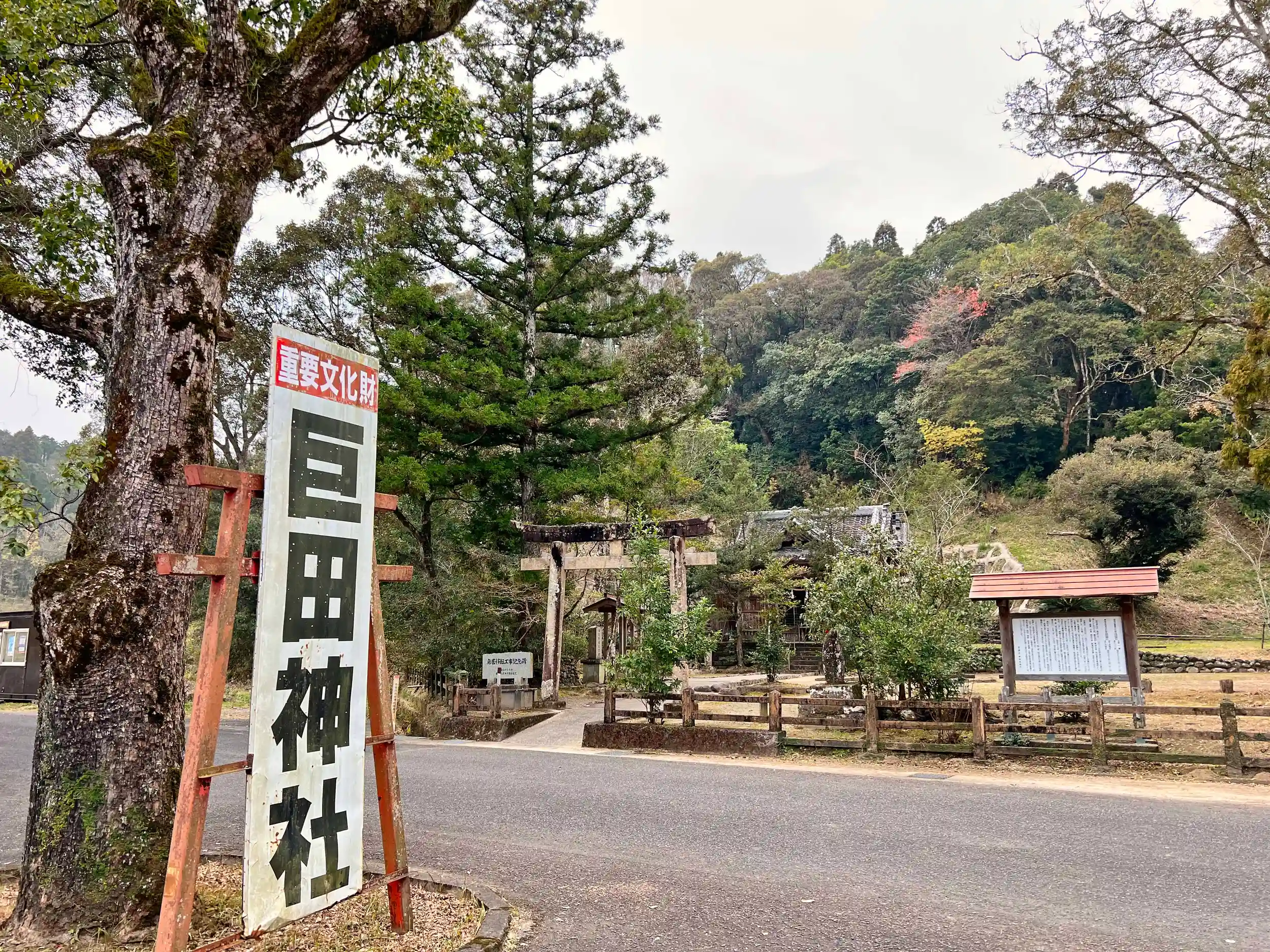 人里離れた道に突如現れる<巨田神社>の看板。