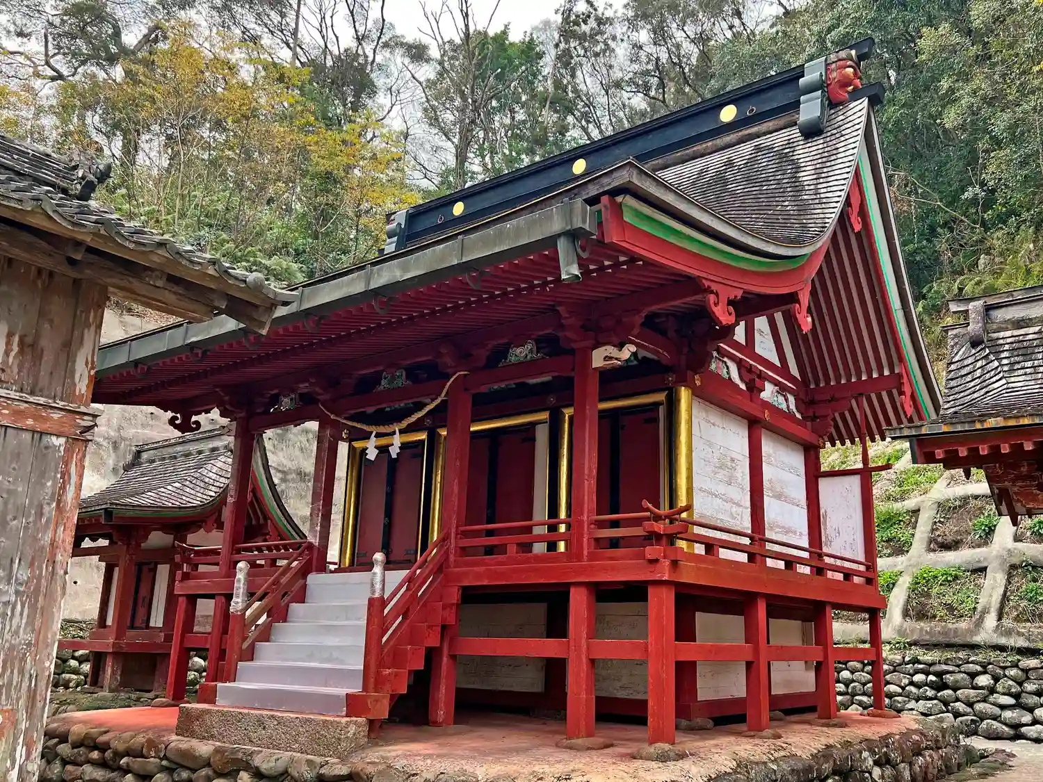 拝殿後ろの<本殿>。その両脇に境内社がある。