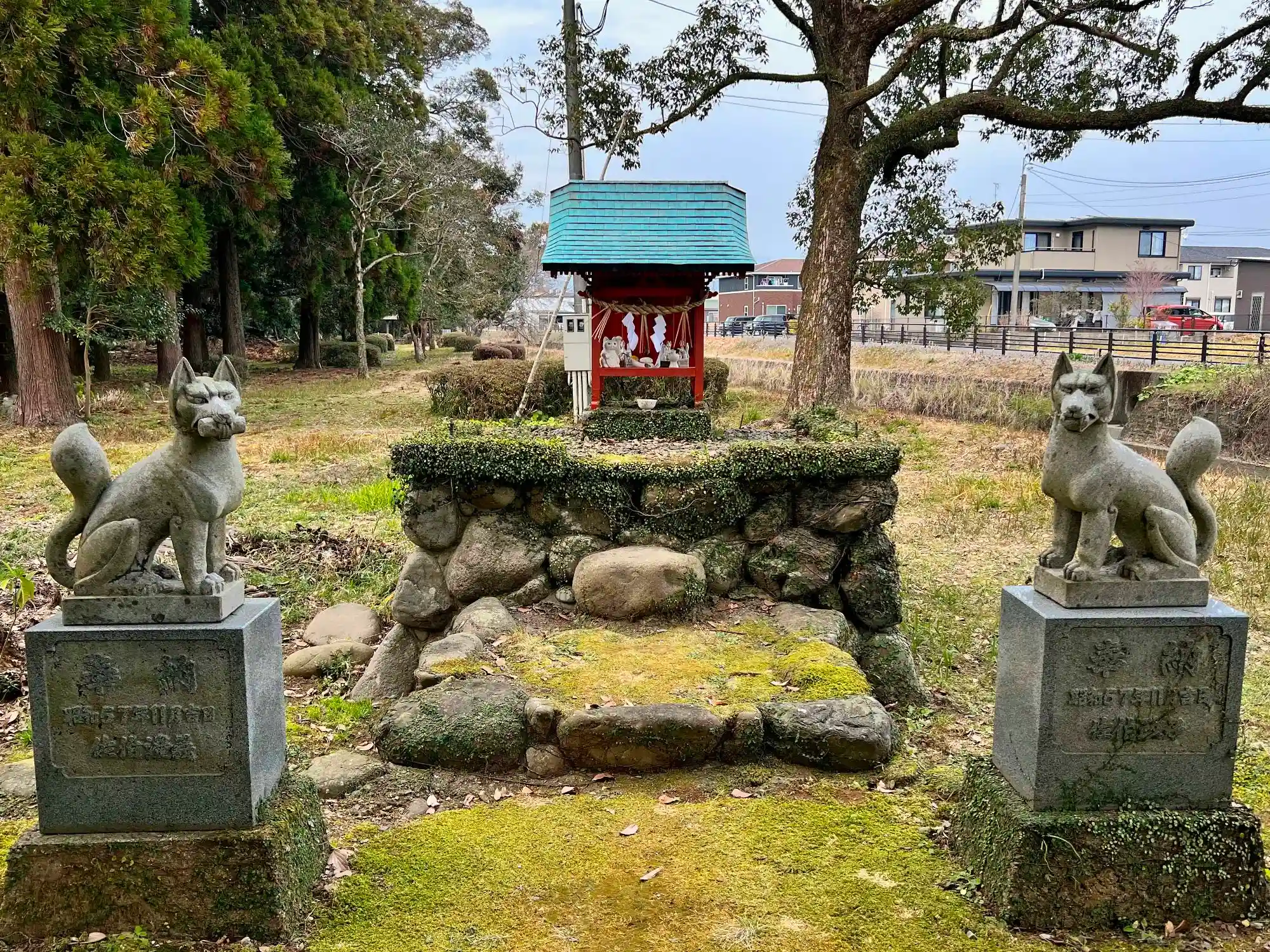 巨木の裏側に廻ると、小さく真っ赤な社殿が。<狛狐>がいるので稲荷神社ですね。(^_^;)