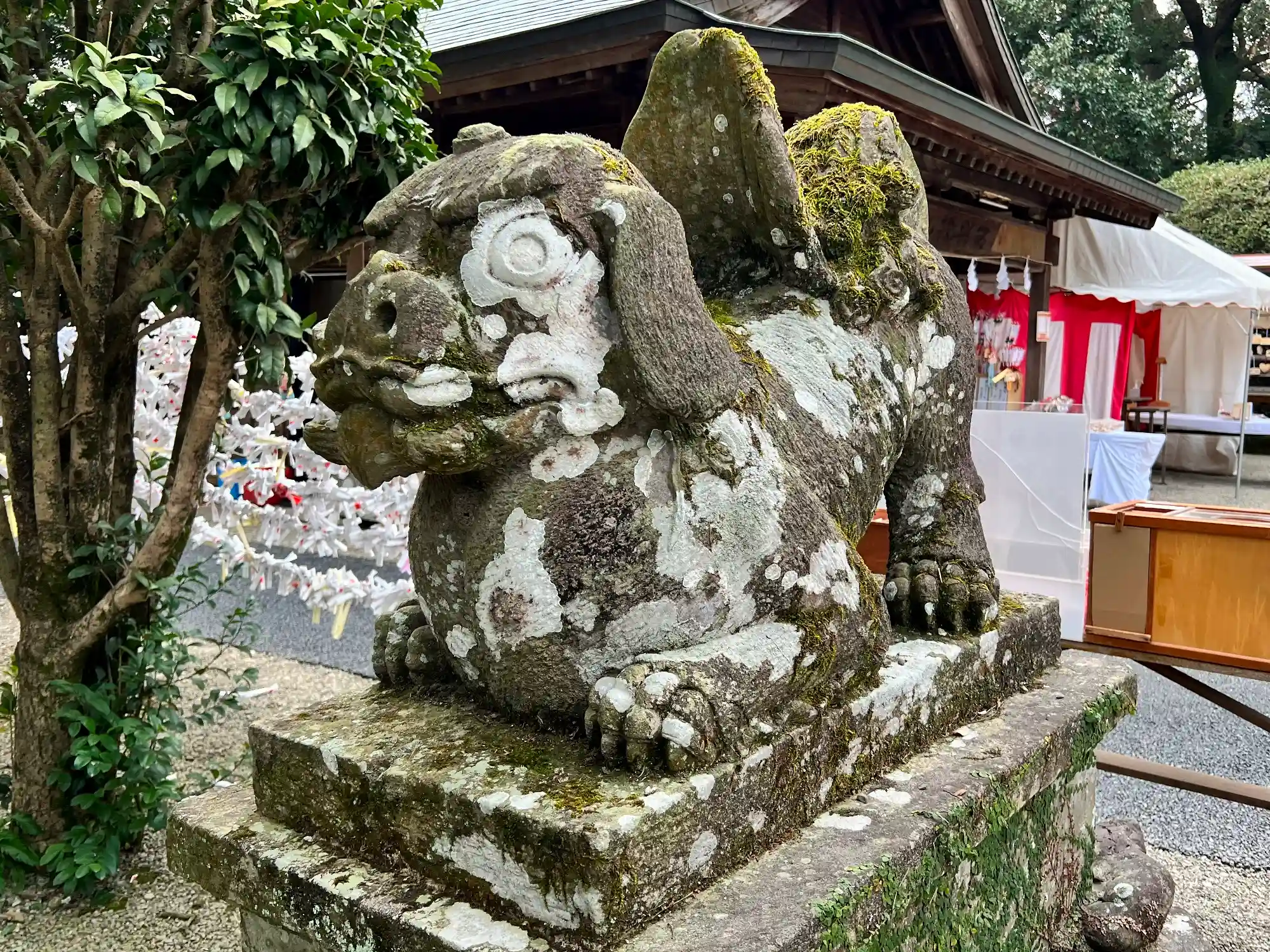 二の鳥居の左側にある<狛犬>。まん丸おめめと、反り立った尻尾が独特。